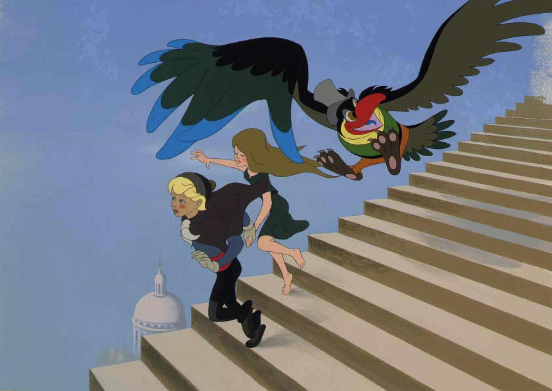 Paul Grimault lance alors les amoureux dans une course-poursuite rythmée sous la protection bienveillante de l’Oiseau. Les sbires du Roi sont envoyés à leurs trousses. Clones moustachus à chapeau melon, la police de Sa Majesté rappelle bien entendu les fameux Dupont et Dupond de Hergé. Mais lorsqu’ils s’élancent dans le ciel, leur parapluie ouvert en guise de parachute, nous ne sommes pas loin non plus du Golconde.