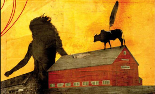 Quelques images du texte. Le chemin est celui qui mène au siège du ranch de William, l’Indien Navajo. La bâtisse rouge : un bâtiment agricole. Le zébu sur le toit, ben voyons… La plume, référence, plus que symbolique, aux Peaux-Rouges. La silhouette féminine noire, celle de Bahia la ténébreuse. Les crêtes découpées du haut : les monts Absaroka, dans l’Etat américain du Wyoming. L’avion : le franchissement de l’Atlantique.