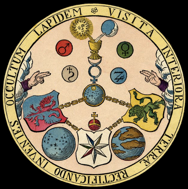 Enfin, bien sûr, la célèbre formule alchimique « V.I.T.R.I.O.L.» ; visita interiora terrae, rectificando invenies occultum lapidem. Pour les non latinistes, dont je suis, visite l’intérieur de la terre et en rectifiant tu trouveras la pierre cachée. On a vu que le franc-maçon et l’alchimiste étaient à la fois maître d’œuvre et matériau, la formule « V.I.T.R.I.O.L. », qui invite à l’introspection indispensable à toute initiation va dans ce sens. J’ai évoqué Jung, ici le parallèle avec la psychanalyse s’impose. N’est-ce pas en visitant les profondeurs de l’Homme, dans les ténèbres intérieures, que le psychanalyste va chercher la lumière, la vérité de l’être ?
