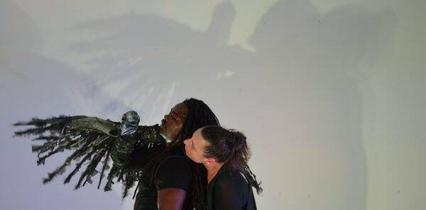 En tant que spectateur, on commence par lire la brochure distribuée en début de spectacle. Il s’agit d’une interview de Valère Novarina qui tente de décrire les grandes lignes de sa pièce : on y parle de spatialité du langage, du théâtre Nô japonais et de son ritualisme sacré, de la scène comme « stade », d’annonement de la mémoire, de manducation, de « mangement de la chose écrite ». On a peur. Ce sera donc du théâtre intellectuel. Cette idée reste gravée dans notre esprit, pendant les quelques premières minutes : on y voit des personnages parler une langue où le sens n’est pas objectif, une langue indéchiffrable et opaque. Il n’y a pas de récit, de synopsis. Seuls s’agitent face à nous des noms de personnages que Novarina a inventés dans son carnet : une petite réserve de 50 000… Pendant que notre esprit est balayé par le mistral, on nous annonce que la mise en scène sera « simplifiée » en raison du vent trop fort, que les machinistes seront comme des anges invisibles qui tenteront de préserver notre sécurité. Cela ne fait pas partie du spectacle original. Le 10 juillet était un jour de climat difficile. Et pourtant. Ces quelques premières minutes passées, le sourire vient se former sur les lèvres et le rire commun du public commence à retentir. La langue poétique de Novarina provoque une véritable jubilation : l’Historienne, sorte de narratrice assez fréquente dans les pièces de Novarina, interprétée par l’actrice russe Claire Sermonne, commence à convoquer une multitude de personnages qui apparaissent sur des brancards, en roulant sur le sol, munis d’accessoires incongrus. Cette invocation est accompagnée de morceaux d’accordéon joués par Christian Paccoud : le charme opère et la poésie prend forme. Lorsque l’Historienne convoque le premier personnage : « Entre, Adam ! », l’acteur apparaît discrètement, le sexe orné d’une feuille d’érable : c’est à la fois terriblement logique et terriblement absurde. C’est de cette confrontation des deux pôles opposés de la raison que naît le rire salvateur et qui sera la clef de voûte de la dynamique théâtrale de la pièce. Pas si intellectuel que ça, finalement.