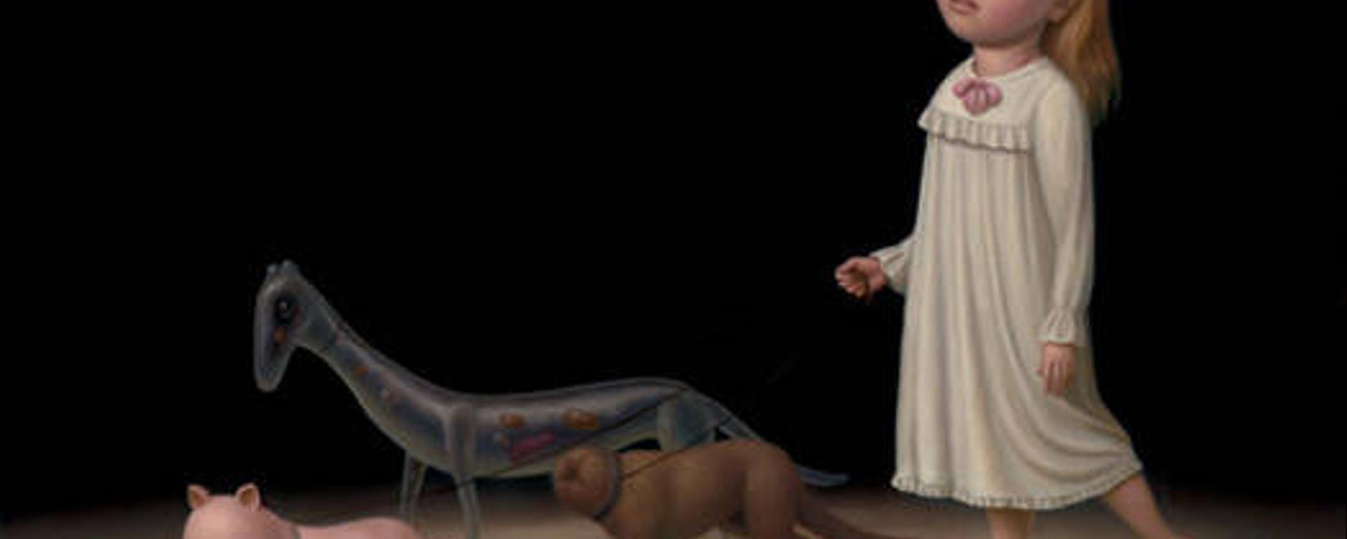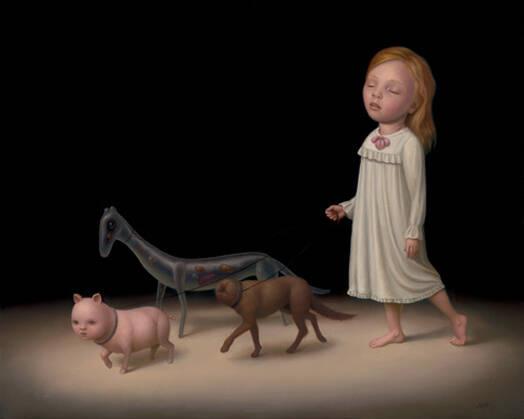 Chaque artiste interroge à sa façon notre rapport au monde et à l’imaginaire. Les toiles de Marion Peck dégagent une impression d’inquiétante étrangeté à laquelle il est difficile d’échapper. Sleepwalk est une incitation à la rêverie. Les couleurs pastels du tableau et l’aspect étrangement humanoïde des animaux en laisse participe à créer une atmosphère à la fois onirique et nostalgique. Il semble que chacune de ses œuvres reprennent des thèmes liés à l’enfance et à l’innocence. La peinture apparaît comme un lieu pouvant convoquer un paradis perdu dans lequel le spectateur peut s’égarer le temps d’un regard.