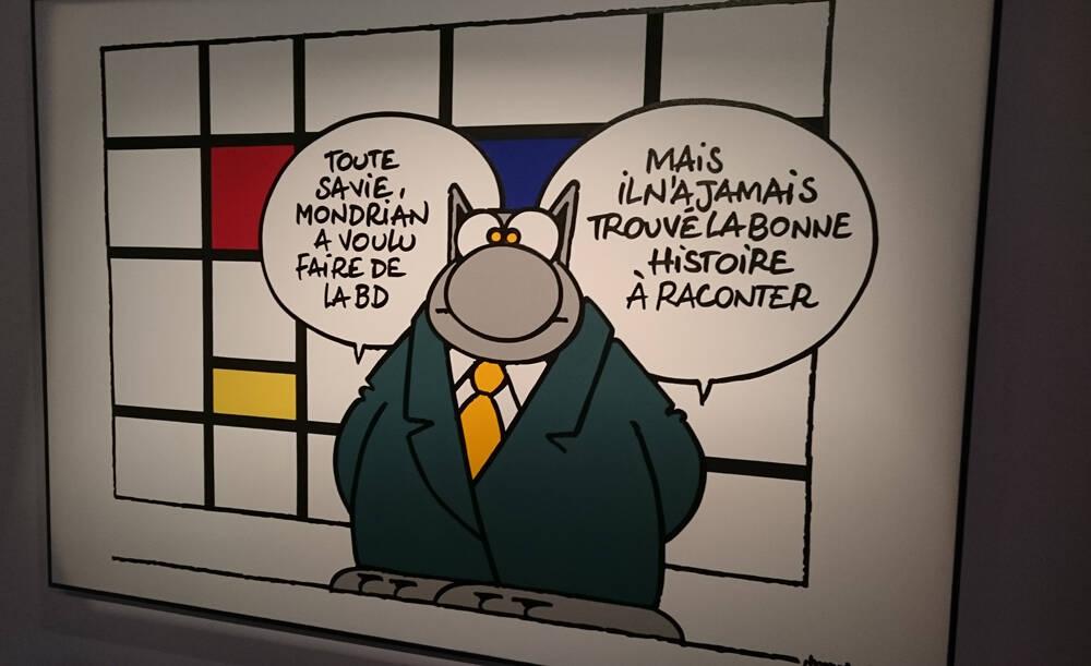 Le félin se joue ainsi des stéréotypes de chaque artiste : les jets de peinture de Pollock, le bleu de Klein, les illusions d’optique de Victor Vasarely, les rectangles de Mondrian… Son créateur emploie même le terme « d’hommage-foutage de gueule, parce qu’on ne sait pas toujours où le situer. » Oui, Geluck est dans le cliché et l’assume : c’est ce qui rend ses œuvres si drôles.