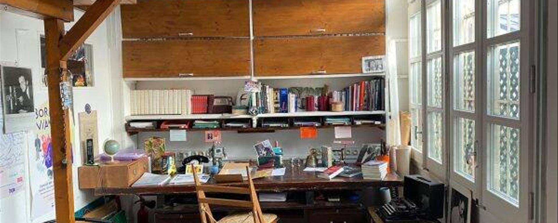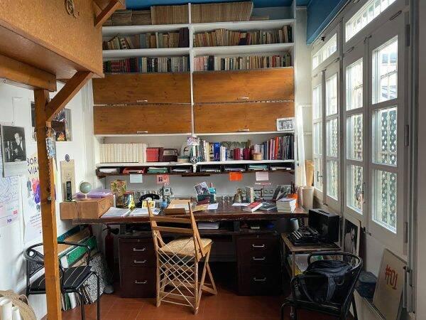 A la droite de l’entrée se situe le bureau, que l’ingénieur ingénieux avait aménagé de telle sorte qu’il puisse étendre ses longues jambes d’escogriffe. Il est devenu depuis le bureau de Nicole Bertolt, qui y a installé, par clin d’œil, des exemplaires des œuvres romanesques dans l’édition de la Pléiade. Il est vrai que Vian avait manqué le prix de la Pléiade en 1946 pour l’Ecume des jours, qui n’eut pas l’heur de plaire au jury composé de Paulhan, Eluard, Malraux, Arland, Camus et d’autres et ce, malgré le soutien de Queneau (qu’il qualifia de « plus poignant des romans d’amour contemporains »), Sartre et Lemarchand.
