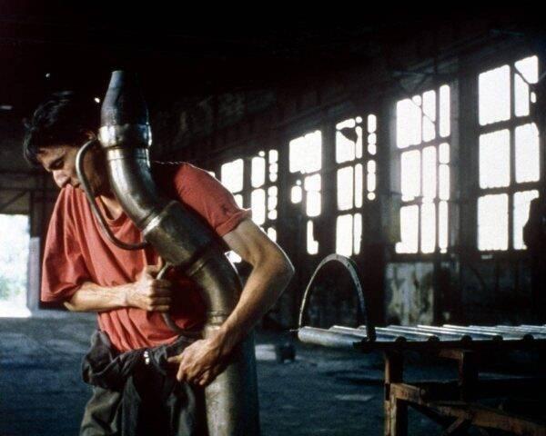 Ce choix de la modulation en lenteur plutôt que des coups d’accélérateur et des points d’orgue, apparente le film à la musique répétitive d’un Steve Reich ou d’un Philip Glass. Une grammaire de la différence dans la répétition. Le film est scandé par l’arrivée de Donand le matin à l’usine, et le rhabillage des ouvriers après la douche le soir. 5 fois Donand le matin, et 5 fois le vestiaire le soir. Mais Donand ne marche pas toujours du même pas, son empressement varie, et, de jour en jour, la caméra nous rapproche du corps nu de Jacques dans le vestiaire… jusqu’au dernier soir où elle se retourne, pour nous montrer ceux venus une dernière fois le regarder. Loin d’un martèlement agressif, la répétition se fait avec calme et douceur. À la fin, à l’inverse de ce film inaugural, la Sortie d’usine des frères Lumière, où les ouvriers s’avancent vers la caméra, Jacques et Louis s’en vont de dos dans le lointain. Mais, tandis que leurs corps s’éloignent, leurs voix restent proches de nous. Cette persistance de la voix nous dit peut-être que fin d’un monde et retombée des désirs ne signifient pas anéantissement et renonciation.