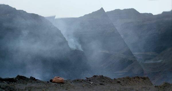 Walter Benjamin[1] appelait « aura » cette propriété qu’ont les œuvres d’apparaître comme lointaines, malgré leur proximité. Cette scène de Malick est un bel exemple de l’aura que peuvent avoir les mondes entre eux. Béhémoth (2015) de Zhao Liang a pour sujet la diffraction de ce genre de distances entre les dimensions d’un même lieu. Ce lieu, c’est les mines de charbon chinoises, creusées dans les hauts plateaux mongols. Et, justement, l’une des premières distances dont traite le documentaire, c’est peut-être celle qui oppose mongols et mines, dans les images du début du film : on aperçoit d’abord une steppe unie, verdoyante, où paissent les brebis et où se tient, au centre, une yourte mongole ; puis le paysage défilant, se lève, devant nous, brutalement, une paroi brune, noire et grise ; verticale tranchante sur l’horizon de la steppe verte. Or ces parois n’ont rien de naturelles. Ce sont des dépôts et des amas de terre ; résidus inutiles du creusement ; charriés par les camions chinois de la mine. Deux mondes s’ignorent et se côtoient – tandis que l’un se répand sur l’autre et le ronge. C’est d’abord ça, le Béhémoth : un monstre de monde qui en dévore un autre.