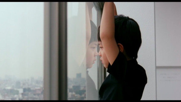 Dans cette séquence de fugue et de repêchage, on passe d’une maison à l’autre, mais aussi d’un fils à l’autre, et du fils au père. Les premiers instants de la séquence nous les vivons au côté de Ryusei, le gamin au cerf-volant vu par la fenêtre, la mère vue en train de dormir à travers l’embrasure de la porte, l’entrée du métro guettée pour voir si le champ est libre. La descente des escaliers à toute vitesse nous amène chez les Saiki. Nous y arrivons pour regarder Keita jouer, le point est fait sur lui. Il s’interrompt, se lève, la caméra suit légèrement son mouvement, il va jusqu’à la porte de la chambre pour écouter. Déçu que Ryota ne soit pas venu pour le chercher lui, il s’éloigne dans la profondeur de la chambre, la caméra continue de faire le point sur lui. Ensuite, on passe de Ryusei dans la voiture, regardant tristement par la fenêtre, à Keita, coincé dans un angle de la baignoire, puis à Ryusei encore quand il braque son pistolet en plastique sur sa mère.