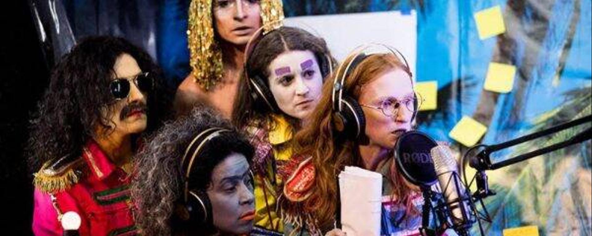 Influence de l’époque, pourrait-croire, dans la tendance actuelle au spectacle-catastrophe, où l’hilarité des personnages sur scène tente de faire désespérément contrepied à l’impression flottante que nous sommes après la fin du monde. Ici, quatre Beatles de pacotille aux couleurs de bonbon et aux voix de petits enfants surexcités s’applaudissent eux-mêmes devant une salle de plus en plus atterrée, et font vite grandir une forme d’angoisse parmi le public. Leurs pitreries sont trop grossières, leurs rires trop forcés. Vient s’ajouter à cette bande de comédiennes déchaînées une ambiance de bunker souterrain, entre le studio d’enregistrement clandestin et la décharge d’ordinateurs. Difficile d’y voir clair dans le babil fiévreux de ces clowns, mais il semblerait bien qu’une certaine forme de catastrophe ait eu lieu : les quatre faux Beatles pleurent la mort du leader de leur groupe, un certain Jésus (rien que ça). Depuis sa disparition, rien ne va plus, le monde est sens dessus dessous et la bande de faux-vrais chanteurs orphelins se sont réfugiés en compagnie d’une jeune prostituée enceinte dans un sous-sol encombré de matelas et de déchets électroniques, pour émettre d’obscurs communiqués sur une radio amateur, entrecoupés de chansons métaphysiques sur le sens de la vie. Difficile aussi d’en dire plus sur les quelques éléments dramatiques qui surnagent dans les conversations des quatre lascars : il y est question de drogues évidemment, mais pas seulement ; aussi de théorie du complot, d’expériences de mort imminente et d’un chanteur qui serait une taupe pour le compte du gouvernement (ou du Ku Klux Klan, mais ça semble être la même chose). En tout cas, ça ne va pas très fort pour nos scarabées époque Sergent Pepper – le fameux lonely hearts club band.