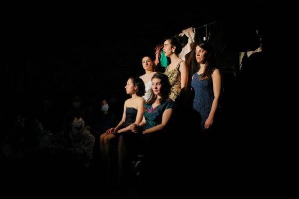 Dans la petite salle du Lavoir moderne parisien, nous faisons cercle autour de cinq jeunes femmes qui nous accueillent sans façons, en pyjama ou petite culotte, la brosse à dents à la bouche, assises derrière leur coiffeuse. C’est aux coulisses de leur transformation en beautés fatales pour le mariage de l’une d’elles que nous allons assister, une transformation qui tient autant de la mutilation que de la farce, comme les injonctions énoncées dans le poème « Recette de femme » de Vinicius de Moraes récité au début de la pièce.