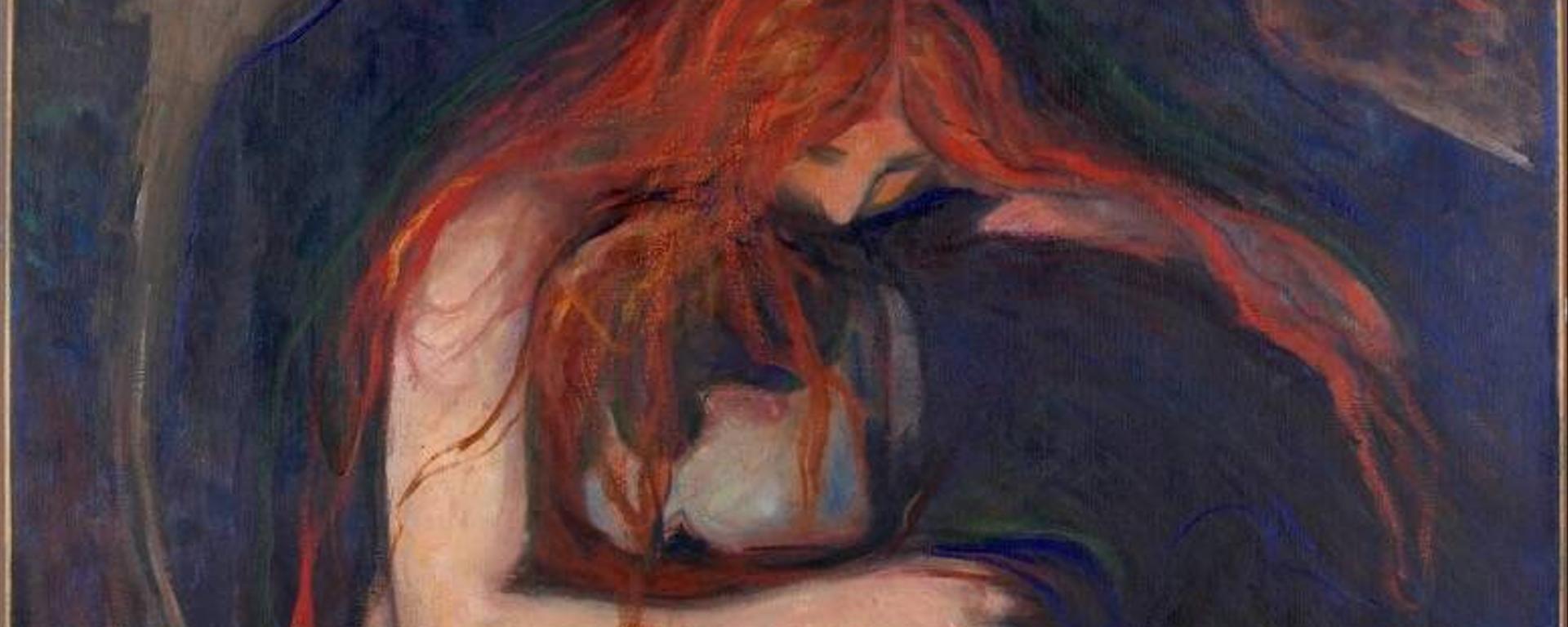 Le Baiser reproduit dans de très belles lithographies, peut être lié à un autre tableau qui présente l’étreinte autrement. Vampire peint en 1895 met en scène deux personnages entrelacés. L’homme, d’abord, enfoui sa tête et tout son buste dans la poitrine d’une femme. Celle-ci, surplombante, le recouvre de ses bras, de ses cheveux. Elle devient prédatrice : ses lèvres – on le devine avec le titre – vont bientôt se poser dans le cou de son amour. Sa “ chevelure de feu de bois” (André Breton, Union Libre, 1931) tentaculaire ruisselle sur le corps de l’amant et renforce cette idée de prédation. Toutefois, le tableau était d’abord intitulé Amour et douleur, soulignant explicitement l’ambiguïté constante des instants de vie : entre plaisir et souffrance. Les contrastes entre les teintes sombres et vives mettent en exergue l’ambivalence, la tension qui dit la vie. Ici encore, l’ombre comme une auréole, encadre les amants. Edvard Munch la conçoit comme une ceinture épaisse et lourde qui isole le couple du monde, qui l’isole du temps qui passe. Il crée même un ourlet en accumulant la matière pour constituer un bourrelet bleu qui annule l’oppression du temps et de l’espace. Ainsi, il scelle leur intimité en donnant à leur étreinte une toute autre mesure. Cette femme peut bien être venimeuse et mortelle – comme le fut Mathilde Tulla Larsen, son amante, qui le contraignit à peindre une phalange en moins après un coup de feu – le moment de l’étreinte comme une ligne de crête montre deux états possibles : la volupté et le malheur.