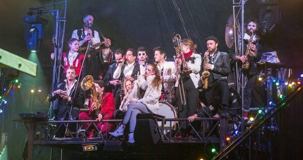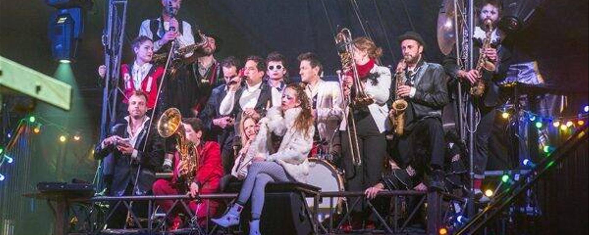 À notre entrée dans le chapiteau, les artistes sont déjà là pour nous accueillir, agglutinés sur une plateforme en hauteur depuis laquelle ils et elles font résonner le son de leurs multiples instruments à vent. Le regard et les oreilles sont cueillis dès la première minute de cette festive installation. Ce n’est qu’après un temps que l’on remarque qu’il en manque quelques-un·es, lorsque l’on suit le regard des enfants vers le ciel : des acrobates en chapeaux hauts-de-forme font des allers-retours irréels d’un bout à l’autre du plafond, suspendu·es à l’envers à des câbles glissants. On remarque alors aussi cet équilibriste solitaire et immobile qui semble attendre l’amour, installé sur un empilement d’échelles au milieu de la piste, tenu par un équilibre que l’on ne croyait pas physiquement possible.