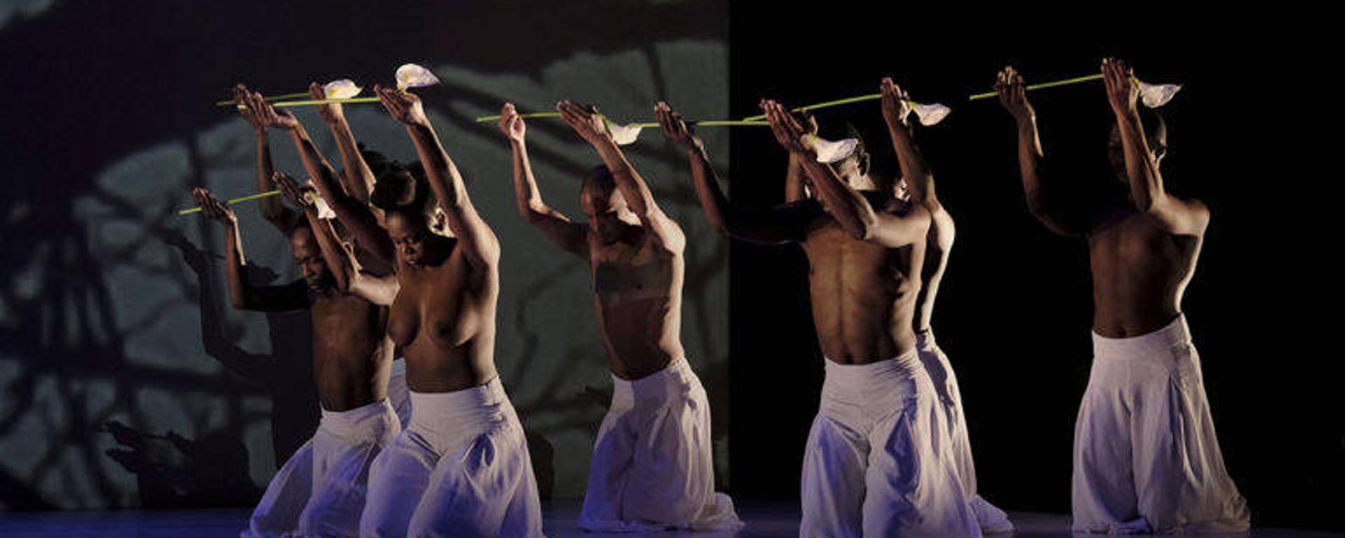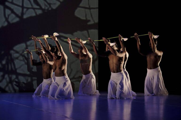 Le Sacrifice est une œuvre de contraste et de rupture, dans la musique, la danse parfois contemporaine et parfois swala et plus généralement dans les tableaux. La première partie légère qui symbolise le renouveau et l’arrivée du printemps, est entachée de drame. Le deuxième tableau où Dada Masilo est choisie comme celle condamnée à mort est comme une montée des eaux. L’ouverture de l’ultime tableau est un duo d’une grande sensibilité, mêlé à une profonde violence. Le corps à moitié nu de Dada finit par être entouré d’hommes écrasants de leur regard qui nous emmène plus loin que l’esthétique de la partition. Puis entrent tous les danseur.euse.s vêtus de blanc, un lys à la main, et dans une lente procession spectacle viennent se recueillir auprès de Dada Masilo. La chanteuse, Ann Masin, soutient l’émotion de la scène avec sa voix profonde et chaleureuse. La maternité, le soutien et le calme de la fin de la pièce nous interrogent sur ce qui a été sacrifié.