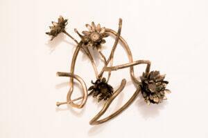 Toujours dans cette veine de la nature morte, les sculptures florales de Victoire Inchauspé font écho à toute cette tradition de la fleur, symbole de vie et de mort. Figée par la sculpture, la fleur de Victoire Inchauspé – dahlia ou marguerite ? – diffuse une poésie lumineuse et légère dans la pièce. Une des sculptures est posée sur un tissu rose, prête à être enveloppée et à être déposée sur un autel imaginaire.