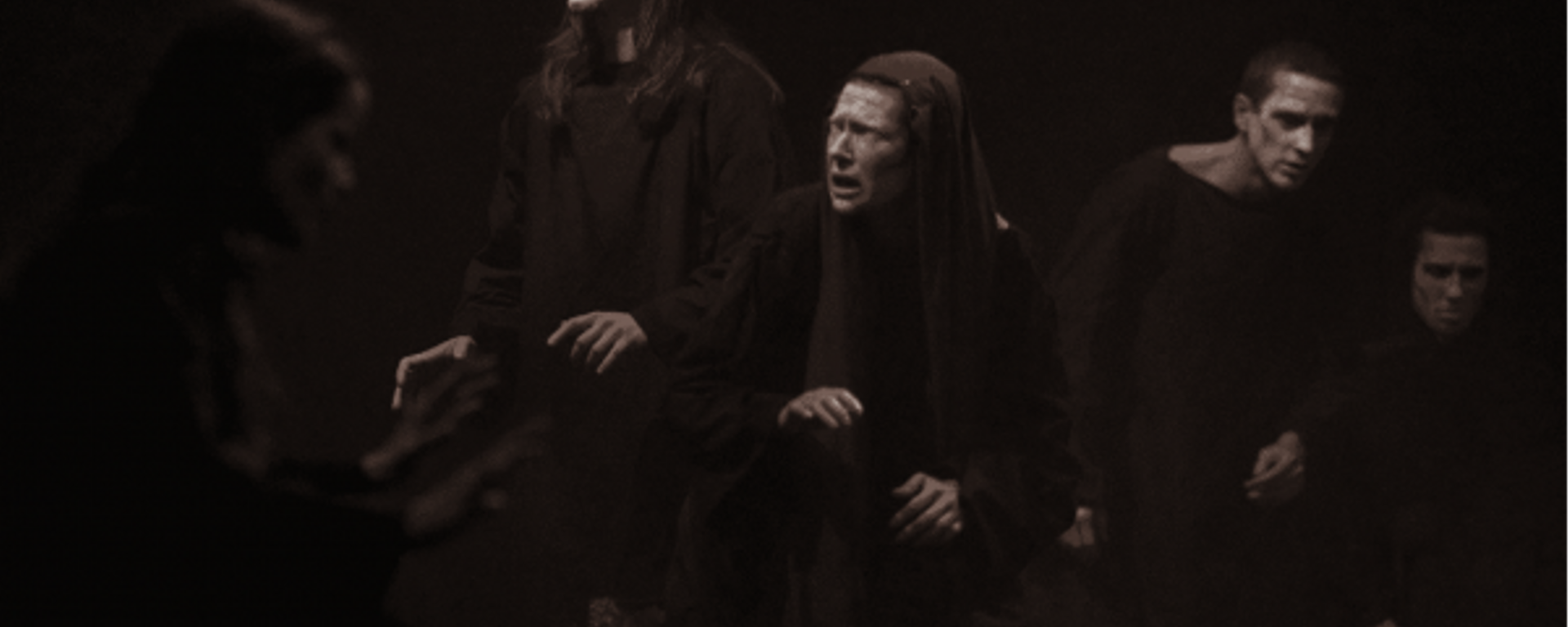 La mise en scène de Clara Koskas et sa compagnie Populo, présentée au théâtre des Déchargeurs, concentre l’action sur les personnages, en resserrant leur nombre. Les Aveugles ne sont plus douze, mais huit : trois hommes, deux vieilles qui prient, une mère muette, et surtout la Jeune Aveugle et la Vieille Aveugle. Cette réorganisation, en soulignant le rôle central de ces deux dernières, n’altère en rien la pièce : elle gagne en force et intensité ce qu’elle perd en polyphonie. S’ouvrant sur un râle dans la pénombre, la proposition se veut fidèle au texte de Maeterlinck, dont elle respecte le décor, les tonalités et le rythme, tout en mobilisant avec grande qualité d’autres genres et traditions théâtrales qui lui servent à signifier par d’autres moyens les mystères édifiés par le texte. Ainsi, le visage recouvert de blanc des comédien.ne.s est une proposition esthétique puissante et riche : symbolisant la cécité en étalant sur leur face la blancheur supposée de leurs pupilles, elle tend vers le jeu masqué, évoquant à la fois acteurs de nô et tragédiens antiques, ancrant ainsi la pièce dans une universalité du tragique.