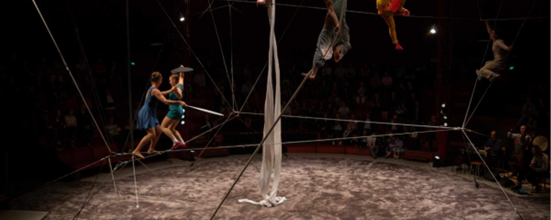 Dans un entrelacement de fils, cordes, tissus et mâts (fixe et oscillant), la compagnie de cirque Les Colporteurs transforme les lignes de fuite en points de rendez-vous. Sept personnages aux airs d’oiseaux y déambulent, tout en équilibre et en grâce, et tentent de réinventer leurs trajectoires. Tout est à réapprendre : se relever, se tenir debout, marcher, puis s’envoler. Dans ce tendre ballet de la réalisation de soi, accompagné par de la musique live modulée par le contact avec les agrès, les performeur·euses tissent un tableau sincère et vif de leur animalité.