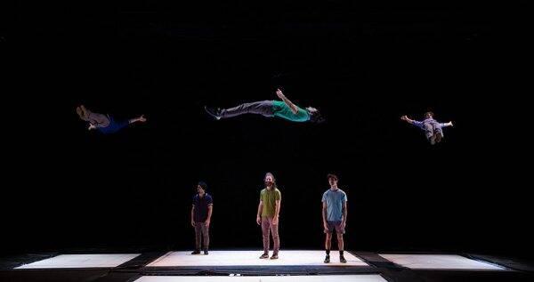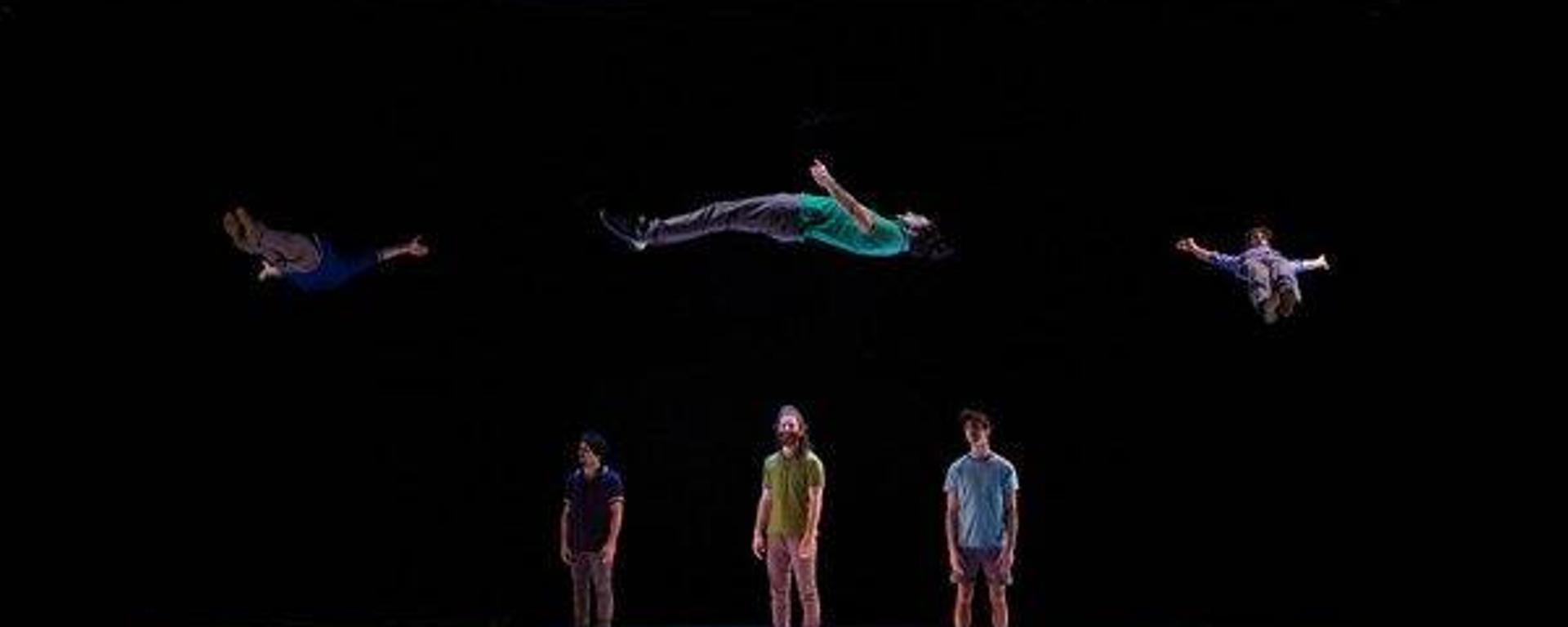Comme tous·tes celles et ceux qui ont déjà essayé de s’envoler, les acrobates cherchent dans leur corps toutes les armes pour déconstruire la gravité. Ils se portent au ralenti, s’envoient délicatement d’une épaule à l’autre, se laissent tomber en arrière… Petit à petit, la ferveur gagne les corps : ils trouvent tous cette propulsion intérieure, ce désir irrépressible de s’élancer vers le haut. Les propulsions des bras ne suffisent plus : on y préfère les trampolines. Trois toiles rebondissantes couvrent en effet des parties de la scène, sur le même plan que le sol. La marche se métamorphose en saut, et les six acrobates deviennent les danseurs de ce ballet envolé.