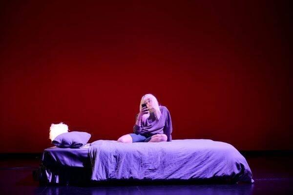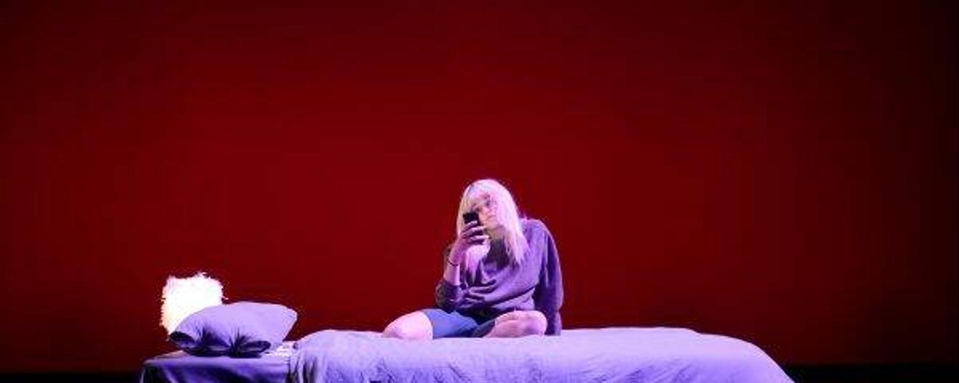 Le dispositif scénique, extrêmement technique et maîtrisé, met évidemment au centre le lit, non-lieu et huis-clos de ce drame virtuel où nous voyons pendant une heure Zed vivre, danser, chanter, avoir peur. Car si ce drame se passe dans les limbes d’internet, il est bien réel pour le corps qui le reçoit : et par ce biais on touche alors aux sujets du harcèlement et de la pédopornographie, et à toute la violence que reçoivent les femmes lorsqu’elles s’exposent sur les réseaux sociaux. La séquence de questions-réponses sur Instagram est particulièrement glaçante. Et la relation qui unit Zed à son téléphone est évidemment une relation liée à l’image : essayer de reproduire les images d’Ariana Grande vues sur Instagram, écouter des vidéos de femmes dénonçant enfin leur viol, jouer avec le feu en discutant avec des « daddys » attirés par son look androgyne de femme fatale garçon.