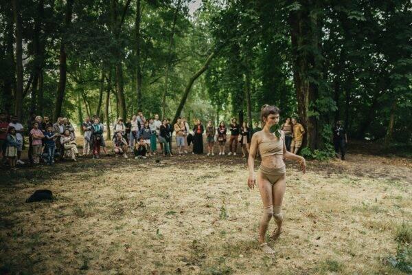 Pour clore en beauté ce premier week-end de festival et célébrer la fin de l’orage, le collectif Maison Courbe a pu prendre ses quartiers en extérieur pour OBAKE, une déambulation surréaliste guidée par Moellon et Parpaing. Avec ce duo de clowns arpenteurs conçu et interprété par Hélène Leveau et Léo Manipoud, le réel a soudain un goût d’herbe, une forme de parapluie, une texture d’argile et une odeur de gravier. Il est l’étonnement, la surprise, la découverte de tout ce qui n’était pourtant pas inconnu.