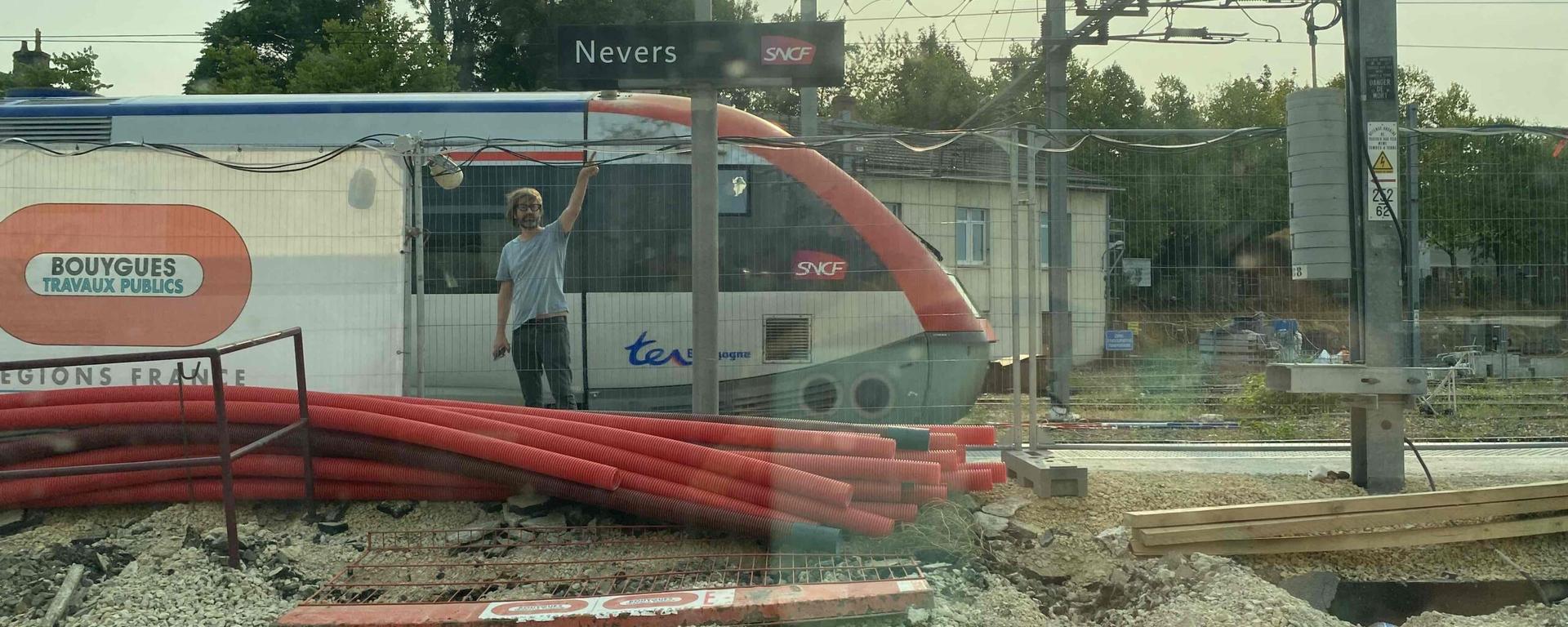 Me serais-je trompé de ville ? Suis-je bien à Nevers ? Je regarde partout, cours partout. Les panneaux « Nevers » quadrillent la gare. Je respire un peu. Mais, suspicieux de nature (je doute naturellement du réel), pour me prouver que je suis bien arrivé à Nevers, je convaincs les deux jumelles, qui squattent un banc en attendant je ne sais quel train ou TER, de me pincer, de me prendre en photo : devant un panneau « Nevers ». J’ai une preuve de moi à Nevers, de l’existence de Nevers, de l’existence de moi à Nevers. Mais le mystère demeure. Pourquoi n’y a-t-il personne pour m’accueillir ?