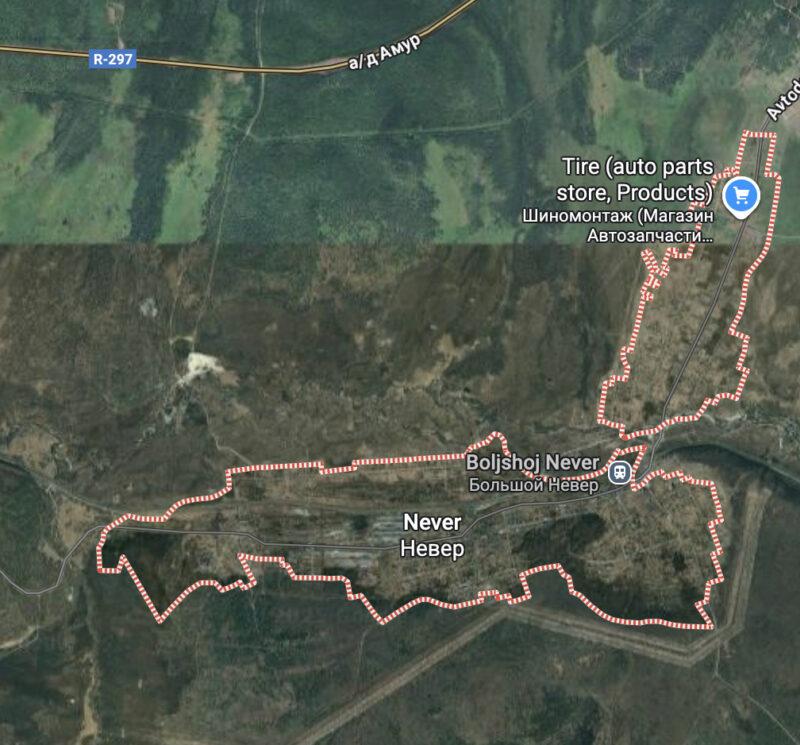Un autre doute, plus existentiel, m’agrippe, gratte à ma porte. Je suis du genre facile à vivre (c’est-à-dire taiseux) mais quand même maniaco-compulsif, un anxieux perfectionniste, si vous voulez, du genre à tout vérifier. Et c’est bien ce que je craignais. Il y a bien une ville en Russie qui s’appelle Never, « Невер », petite localité de 1112 âmes située dans l’oblast de l’Amour, en plein cœur de l’Extrême-Orient russe. Un carrefour routier stratégique, localisé dans le Selsoviet de Neversky, sur la route du Transsibérien, que longe l’autoroute fédérale Amour.