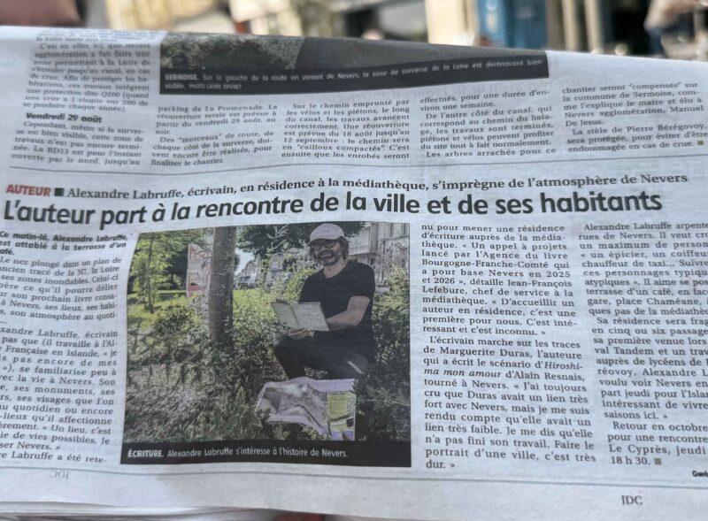 Lorsque la journaliste du Journal du Centre, présentée par la médiathèque, me demande pourquoi Nevers ? Pourquoi venir à Nevers en résidence d’écriture ? Je panique. A deux doigts de dire que je viens là pour relancer l’enquête sur la mort de Bérégovoy en 1993, je rattrape, in extremis, ma réponse. Je tourne sept fois la langue dans mon cerveau. Je ferme les yeux. Je me concentre. Cerveau tenu au lasso, je réponds posément, professionnellement, solennellement :