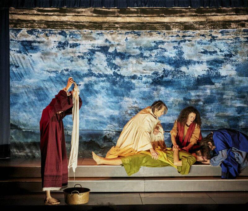 Le spectacle s’ouvre sur une première partie de « pur théâtre » où les cinq comédiens : Justine Bachelet, Solenne Keravis, Emmanuel Matte, Charles Zévaco et Juliette Plumecocq-Mech, rejouent, avec outrance et non sans une certaine délectation toute sensible pour le spectateur, des scènes devenues cultes au théâtre où le personnage en jeu se trouve sur le point de mourir. Pourtant, par l’excès et la démesure de ces interprétations, où les comédiens et comédiennes se jettent sur un matelas au bord du plateau, par leur bouffonnerie et par leur dimension grotesque, ces scènes, que le spectateur attend habituellement avec impatience dans les pièces en question -pour ce qu’elles relèvent bien souvent de la prouesse d’interprétation et concentrent la tension dramatique et tragique, ouvrent la réflexion autour de la double question de la place de la mort au théâtre et, derrière elle, de notre propre rapport à l’imminence de la mort.