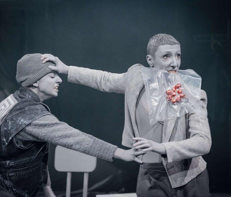 L’exemple le plus frappant de ce traitement à contre-courant se situe dans la façon de penser la scénographie ; non comme un simple décor singeant l’espace numérique mais comme un support – à la fois discret et omniprésent – obligatoire au jeu. À rebours des attentes et d’une grande qualité plastique, le travail de la scénographe Jane Joyet fait le choix du monochrome gris, épousant une sobriété visuelle inattendue. Par ce procédé, le plateau devient pleinement un espace ludique, assurément virtuel car modulable à souhait au gré des parties. Pour preuve, les nombreuses chutes d’éléments de mobilier qui rythment la représentation rappellent le système vidéoludique du housing, bien connu des joueurs et joueuses de simulations de vie telle que Les Sims.