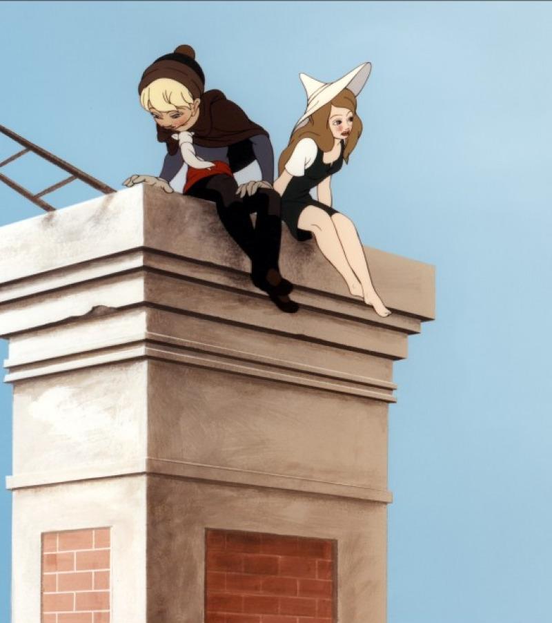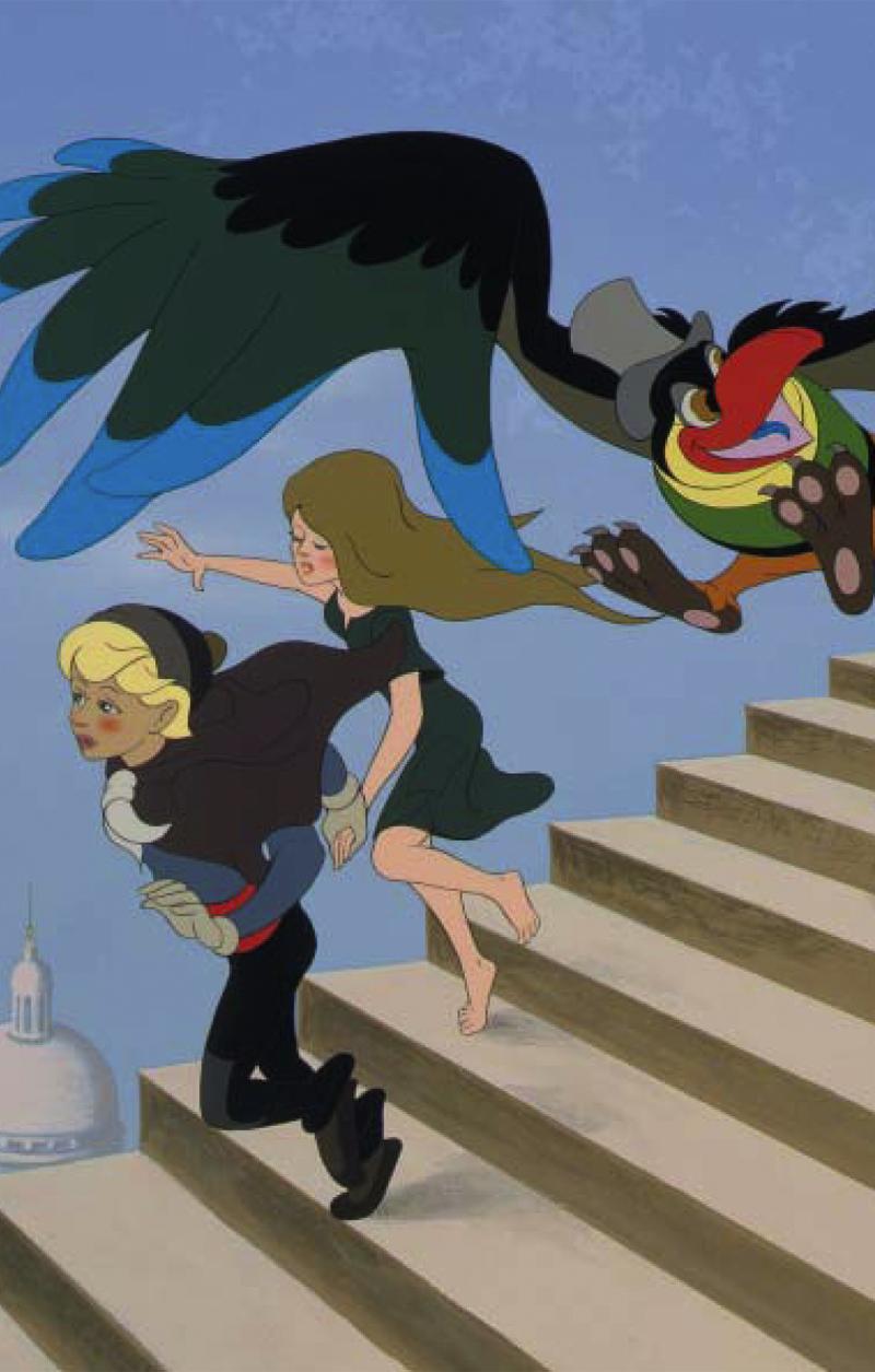 Paul Grimault lance alors les amoureux dans une course-poursuite rythmée sous la protection bienveillante de l’Oiseau. Les sbires du Roi sont envoyés à leurs trousses. Clones moustachus à chapeau melon, la police de Sa Majesté rappelle bien entendu les fameux Dupont et Dupond de Hergé. Mais lorsqu’ils s’élancent dans le ciel, leur parapluie ouvert en guise de parachute, nous ne sommes pas loin non plus du Golconde.