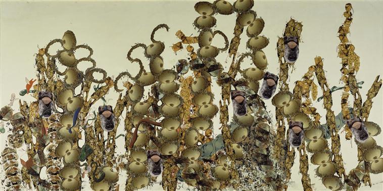 À partir de 1957, avec ses Papiers choisis, Réquichot donne une totale liberté aux collages qui envahissent progressivement toute la toile, où la peinture n’apparaît plus qu’en rehauts discrets fondus dans un univers brouillé. Et c’est du côté des illustrations de nourriture que Réquichot va trouver sa grande source d’inspiration. Dans La Cocarde. Le déchet des continents (où j’ai longtemps pris le museau du chien pour une autruche), ou encore Le Palais de torchons, sont agrégés des fragments de nourriture avec des parties de corps animaux. Dérangeant…