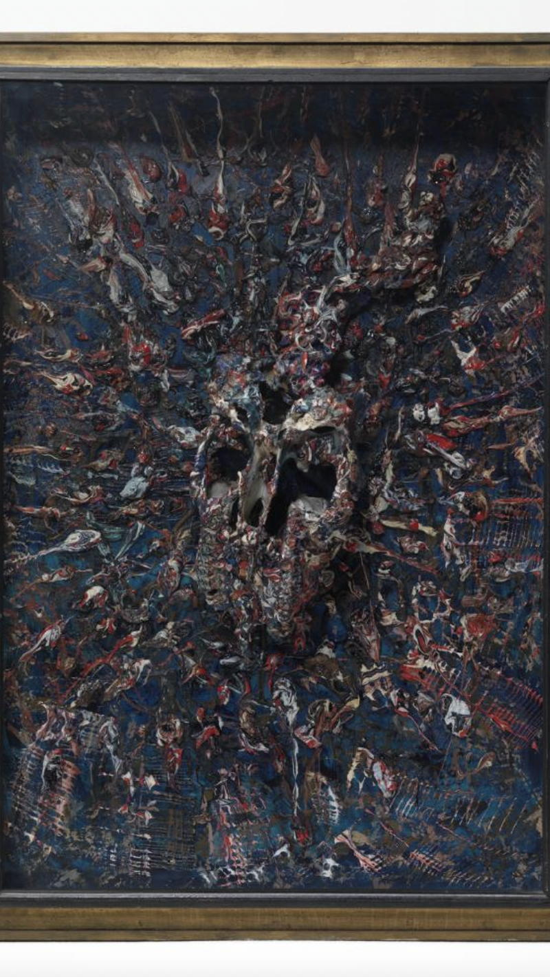 Le plus haut degré d’originalité de Réquichot est sans doute à trouver du côté des reliquaires, dont l’exposition réserve une place de choix avec cinq de ces objets mystérieux exposés. Ces boîtes, parfois vitrées parfois ouvertes, toujours inapprochables, où un délire de peinture recouvre des objets hétéroclites, chaussures ou carcasses d’animaux, violemment compactés. L’armoire de Barbe Bleue, reprenant la technique des toiles roulées que l’artiste utilisera la même année pour son Iris Bizarre, est un chef-d’œuvre de mystères, d’effroi, de silence, d’ironie.