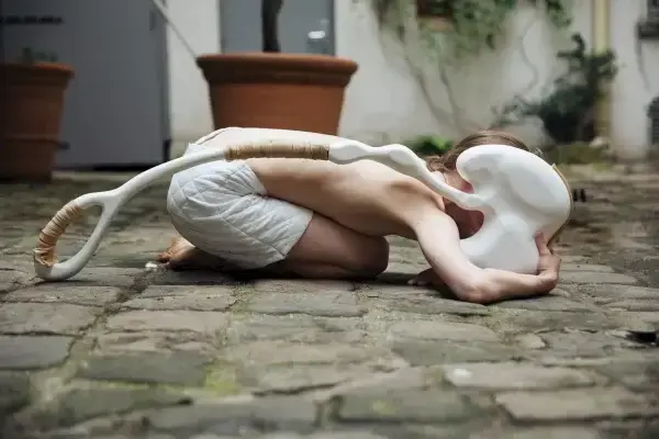 Comment communiquer, créer ensemble entre être animé et objet inerte ? Les sculptures, conçues pour Ruth Childs, invitent à l’invention de gestes permettant de se projeter dans un imaginaire multiforme et mouvant. “L’ambiguïté (…) rend le corps hésitant, curieux, fragile et joueur. Ces incertitudes face aux objets et aux comportements qu’ils insinuent créent une métamorphose perpétuelle du geste, du rythme et de l’humeur.”C’est par cette incertitude qu’objets et danseuse deviennent partenaires. L’objet est à la fois exogène, forme étrange et étrangère, et continuité du corps, prolongement de son ossature. Un trouble que Ruth Childs et Cécile Bouffard entretiennent, ne cherchant jamais à résoudre. Il ne s’agit pas de ne faire qu’un, mais de créer un ensemble en observant les endroits de jonction, là où le corps et l’objet, la danse et la sculpture, peuvent se rejoindre.