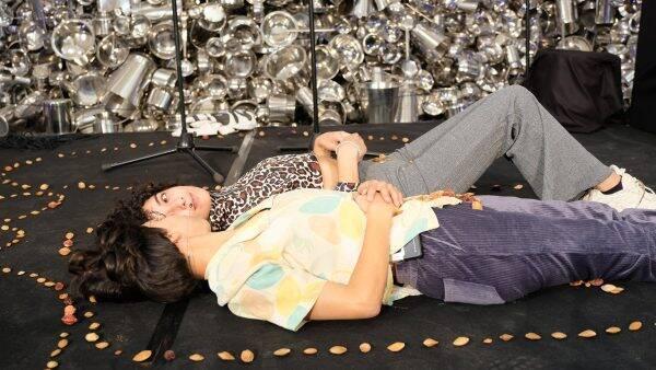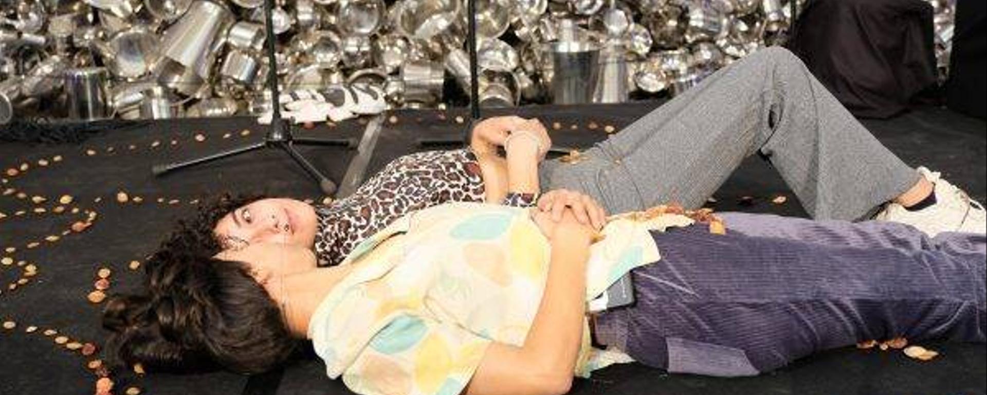 D’un regard complice, les jumeaux·elles guettent notre arrivée. Les spectateur·rice·s sont invité·e·s à entrer dans un cocon familial : une petite estrade qui trône au cœur d’une rotonde, devant la monumentale œuvre de Subodh Gupta, God Hungry. Y siègent quelques micros, une corde à linge sur laquelle pendent des épingles, une théière, des verres à thé sur une table basse, et au sol, des noyaux. Quelque part entre le plateau et la chambre, les performeur·se·s nous convient à une mise en scène de l’intime. Nous entrons dans leur autobiographie comme on entame une psychanalyse, quand la narration commence, elle s’insularise dans le souvenir. Nous découvrons des moments magiques de proximité où les deux auteur·rice·s, sonorisé·e·s par des micros HF, se maquillent puis s’habillent, en se racontant des banalités desquelles jaillit la magnificence de l’ordinaire. Étant donné que leur vécu constitue le ressort du travail, la performance – mot choisi à dessein pour éviter de « représenter » – se situe sur une ligne fragile entre le jeu et le non-jeu. Parfois leurs voix déclament, d’autres fois elles chuchotent, tantôt elles tremblotent. Leur ton donne à l’œuvre une sincérité manifeste, une franchise assumée qui va droit au cœur. Mais cette intimité n’est pas immodérément intimiste, c’est-à-dire qu’elle n’est pas uniquement centrée sur leur vécu, elle a quelque chose de politique. En d’autres termes, lorsque la première personne du singulier est employée, c’est pour mieux parler à la première personne du pluriel.