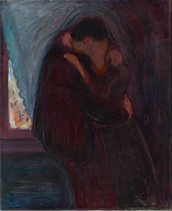 Le Baiser reproduit dans de très belles lithographies, peut être lié à un autre tableau qui présente l’étreinte autrement. Vampire peint en 1895 met en scène deux personnages entrelacés. L’homme, d’abord, enfoui sa tête et tout son buste dans la poitrine d’une femme. Celle-ci, surplombante, le recouvre de ses bras, de ses cheveux. Elle devient prédatrice : ses lèvres – on le devine avec le titre – vont bientôt se poser dans le cou de son amour. Sa “ chevelure de feu de bois” (André Breton, Union Libre, 1931) tentaculaire ruisselle sur le corps de l’amant et renforce cette idée de prédation. Toutefois, le tableau était d’abord intitulé Amour et douleur, soulignant explicitement l’ambiguïté constante des instants de vie : entre plaisir et souffrance. Les contrastes entre les teintes sombres et vives mettent en exergue l’ambivalence, la tension qui dit la vie. Ici encore, l’ombre comme une auréole, encadre les amants. Edvard Munch la conçoit comme une ceinture épaisse et lourde qui isole le couple du monde, qui l’isole du temps qui passe. Il crée même un ourlet en accumulant la matière pour constituer un bourrelet bleu qui annule l’oppression du temps et de l’espace. Ainsi, il scelle leur intimité en donnant à leur étreinte une toute autre mesure. Cette femme peut bien être venimeuse et mortelle – comme le fut Mathilde Tulla Larsen, son amante, qui le contraignit à peindre une phalange en moins après un coup de feu – le moment de l’étreinte comme une ligne de crête montre deux états possibles : la volupté et le malheur.