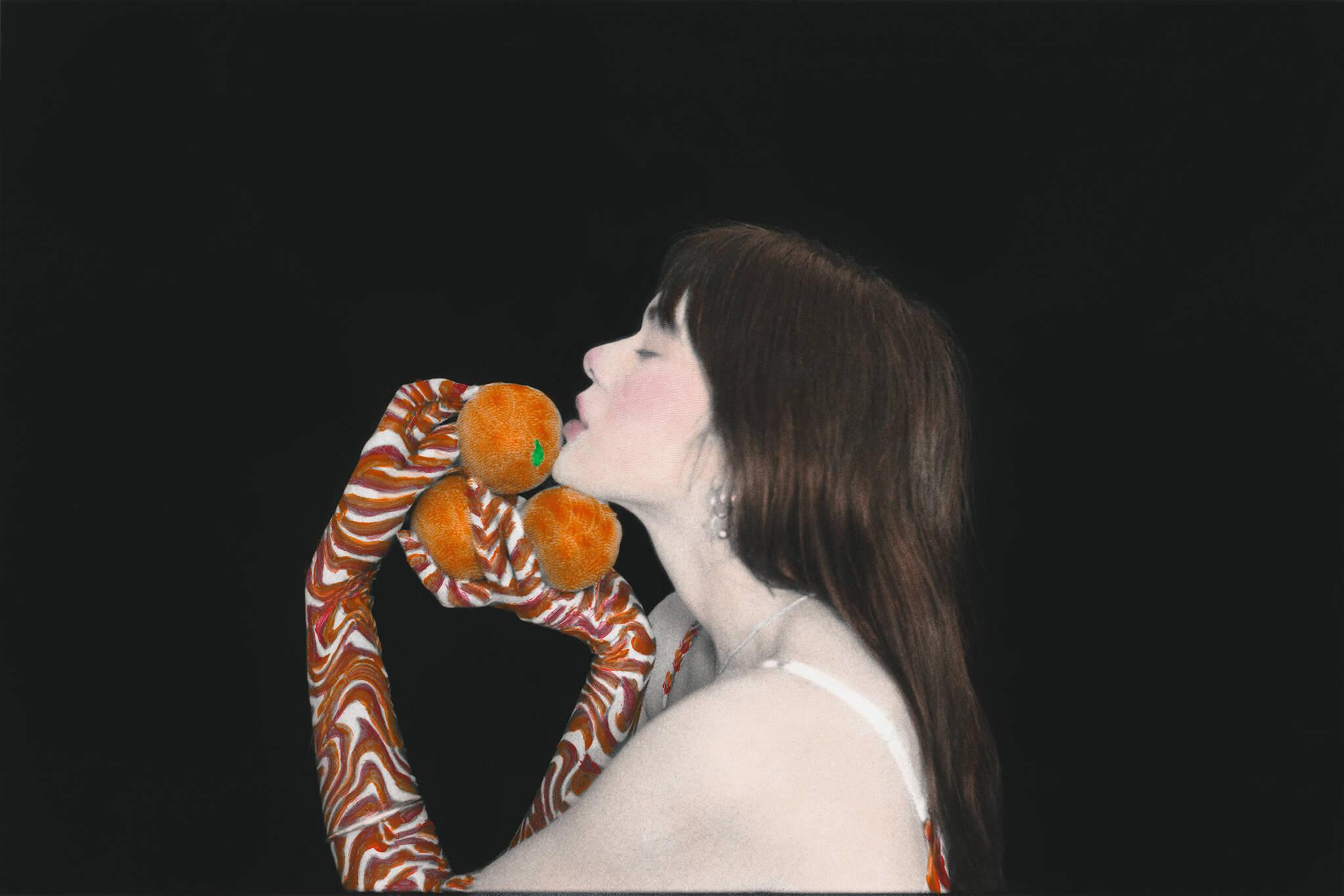 Et entre les deux, il y a le processus de développement que je fais moi-même dans ma cuisine parisienne. Les trois étapes me fascinent. Dans la photo, j’aime le moment où tout se fige et où je fais mon cadre. Tout s’arrête. Je sais que je capture un fragment de vie qui n’en sera plus après mes modifications. J’adore aussi le moment où dans la cuve l’image sur le négatif se révèle, je suis toujours très excitée. C’est le petit moment magique du processus. Concernant le moment de la peinture, c’est un moment très calme, très apaisé où je choisis mes couleurs. À Paris, on est sans arrêt pris dans une frénésie tandis que quand vient le temps de la peinture, je suis toute seule, dans l’obscurité avec ma petite lampe et je me pose. Je peins souvent l’arrière-plan, la peau et ce que je préfère c’est le moment où j’applique du rouge sur les joues et les lèvres, je le fais avec mes doigts et, de fait, mes empreintes digitales restent. Je donne d’une certaine façon mon ADN à la photo.