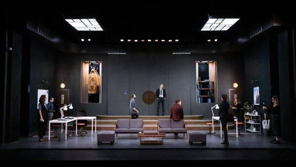 Ce n’est pas tant la vraisemblance de l’histoire qui importe aux artistes, que la manière dont s’invente le fait politique. Par les yeux de Moïra, personnage-narratrice et chargée de communication du parti, nous entrons dans le ballet des open spaces. En ouvrant la pièce d’une délectable tirade face au public dans laquelle elle décrit le double portrait Les Ambassadeurs (1533), son rôle à la fois intra et extradiégétique nous fait regarder la politique par le petit bout de la lorgnette pour en révéler toute la vanité que peint Hans Holbein le Jeune via une tête de mort en anamorphose. La narration nous plonge à pic dans les méandres de cette course folle au bulletin de vote, sur une tonalité épique accompagnée d’une musique grandiloquente à chaque changement de scène, rythmée par un décompte des 10 derniers jours. Nous y voyons les mièvreries des BCBG infidèles, leurs fins jeux de dupes, et la pesante atmosphère d’espionnage qui règne au bureau, grâce à 9 acteurs qui interprètent brillamment une partition minutieuse et des dialogues érudits.