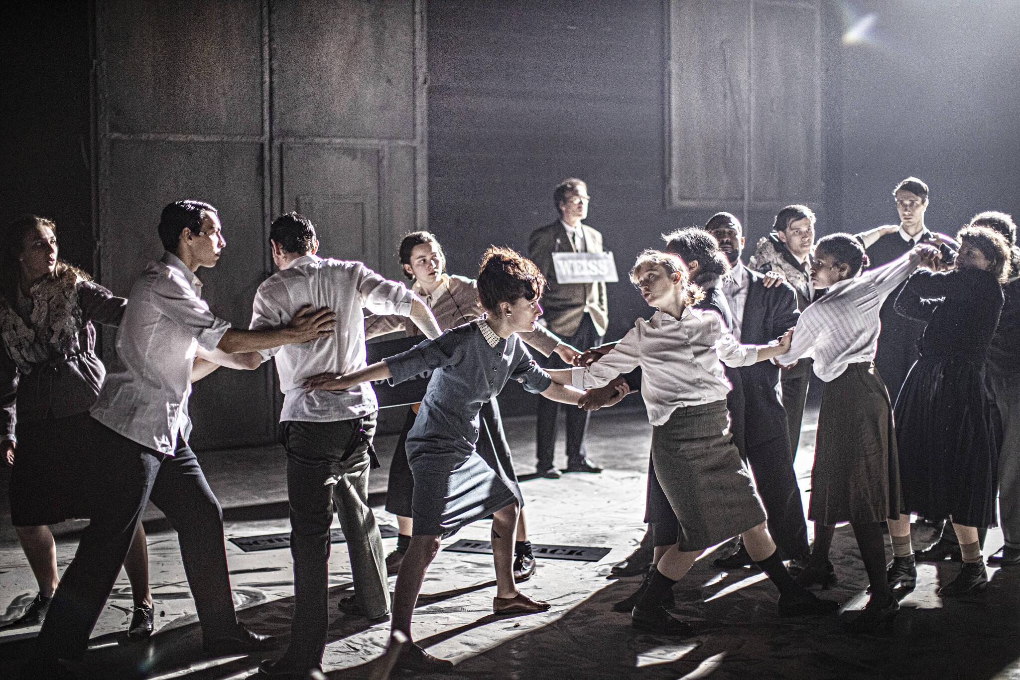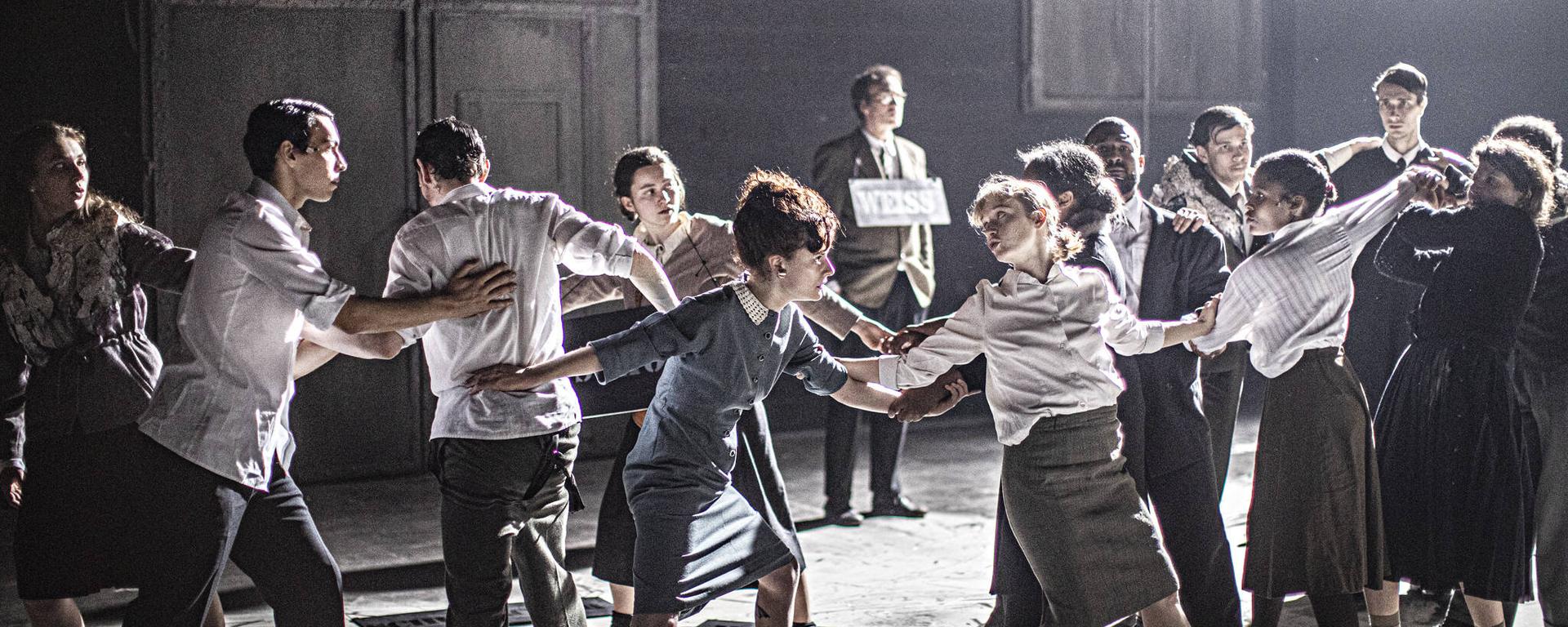 La convergence des forces est le système-même de la création de cette pièce. Pour répondre à la densité de l’œuvre de Weiss, le metteur en scène choisit la force du groupe, il dit de l’œuvre qu’elle « appelle à allier ses forces, ses énergies, ses désirs, et à s’associer à plusieurs, comme on peut le faire face à une matière qu’il n’est pas possible de transformer seul ». (Cette citation, et les suivantes, sont issues d’un entretien réalisé par David Samson pour le Festival d’automne 2023.) Le théâtre se fait ici troupe, groupe, promotion même : celle du TNS, dont les jeunes acteur.ice.s sortent de cinq ans d’étude et de vie commune. Ils existent sur scène en réel chœur à la manière des antiques et nous racontent notre propre fable. Le groupe sur le plateau répond à la foule dans la salle et réfléchit notre histoire, tout comme l’actualité s’est faite miroir de l’œuvre qu’ils étudiaient lors du processus de création : « Ce qui nous environnait faisait s’allumer dans le texte de plus en plus de miroirs. Ce qui au départ était un travail d’école rentrait en fusion avec certaines situations présentes. » C’est justement ce qui donne à ce spectacle sa force de projection : nous voyons se déployer sous nos yeux la montée du fascisme qui rentre étrangement bien en résonance avec l’actualité. De nombreux échos donc, aussi bien dans le procédé de travail que dans la forme et le contenu du spectacle.