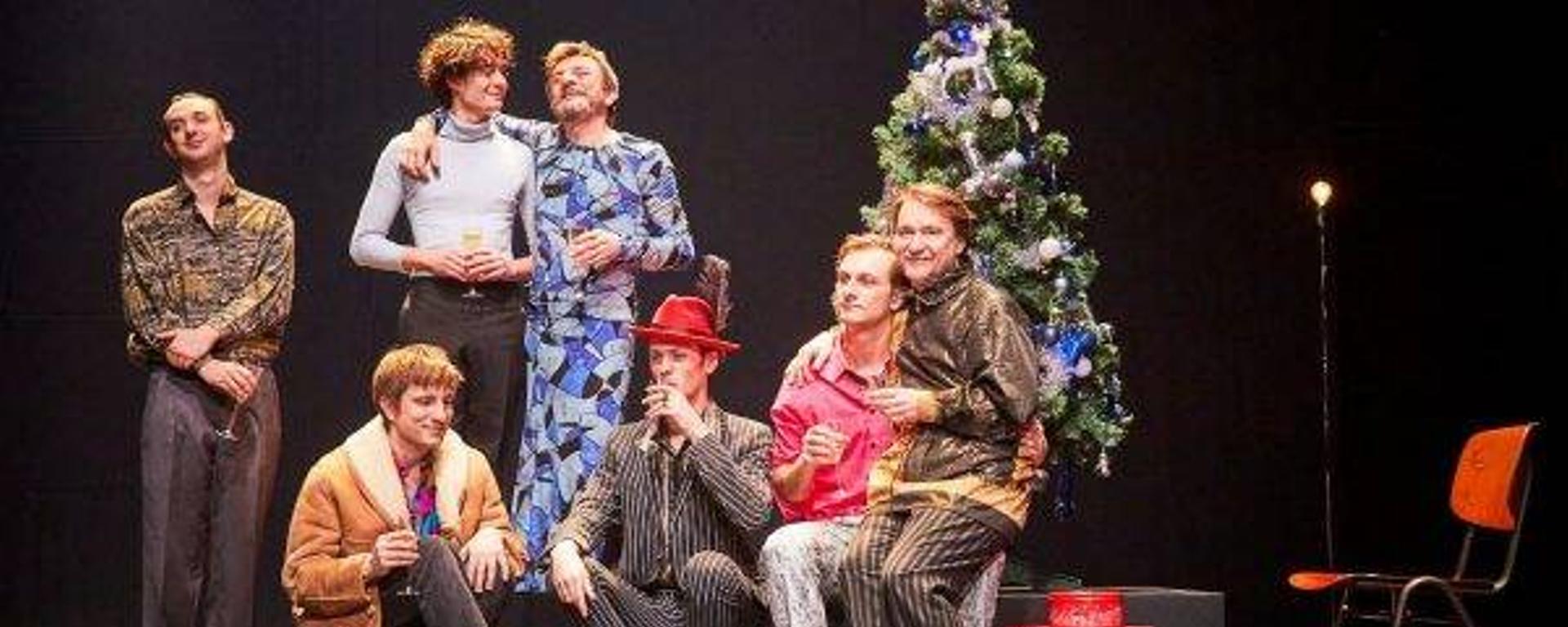 Dans N’essuie jamais de larmes sans gants, la bande de gays que nous suivons jusqu’à la fin du récit, bien qu’hétéroclite (en âge, origines, croyances, mode de vie…), partage un point commun : tous ont rejeté ou été rejetés par leur famille, du fait de leur homosexualité. Cet isolement est le fondement de leur lien. Ce qu’ils ne peuvent partager avec le monde extérieur, ils le partagent entre eux, allant jusqu’à se réapproprier les fêtes traditionnellement « familiales » : on assiste à plusieurs réveillons de Noël à l’esthétique éclatante. Costumes, décors, musique et lumières, tout nous fait ressentir une explosion – de joie, d’abondance, de fièvre ; une envie de vivre trop forte pour être contenue dans le petit salon calme aux couleurs froides de la maison des parents de Rasmus, déçus de l’absence de leur fils dont ils ne connaissent pas encore le secret. La superposition des deux tableaux crée sur scène un contraste frappant, qui plus que n’importe quelle tirade didactique nous fait comprendre la distance infranchissable entre le jeune homme et ses parents. Quand, plus tard, il leur révélera son homosexualité, sans excuses, sans attentes, implacable et intransigeant, leur réaction ne semble pourtant pas justifier une telle défiance. Mais l’avenir lui donnant raison, nous ne pouvons en être surprisE. Rasmus, jeune gay parmi tant d’autres à une époque où l’homosexualité est encore classifiée comme maladie mentale par l’OMS, sait à quoi s’attendre. Il s’est nourri de l’expérience de tant d’autres avant lui. Se choisir une autre famille, une famille qui lui ressemble, qui le comprend, ce n’est pas seulement se protéger, c’est s’autoriser à vivre. A glisser, jour après jour, scène après scène, dans des vêtements-costumes toujours plus lumineux, à aller chercher les néons des discothèques et le soleil chaud de la plage, à virevolter sous la neige pour un premier baiser tournoyant.