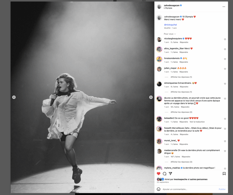 J’ai l’impression de la connaître, non pas comme une amie mais comme une personne qui polit certains fragments de vie un peu trop tranchants. Si je devais la décrire, je dirais qu’elle a cette faculté de projeter des émotions avec une puissance qui semble infinie. D’ailleurs, si l’on y prête attention, son public vibre en chœur avec les méga-enceintes qui diffusent la voix tel un nectar qui exalte et répare. Souvent, après les concerts, Zaho poste sur Instagram des clichés d’elle et de gens de la foule, sa foule. Certains tiennent un mouchoir au creux de leur visage, émus aux larmes, d’autres sourient comme ils souriraient à une petite fille, d’autres encore sont mutiques, les yeux fermés, e...