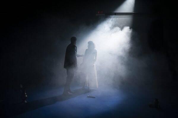 Sous la plume de Jelinek, Eurydice file la métaphore de l’ombre et de l’invisible pour parler de la place des femmes, dans le couple, la création, la reconnaissance sociale, l’apparence. En choisissant de rester parmi les ombres, Eurydice non seulement atteste d’un état déjà avéré de la femme, mais elle accentue cette invisibilité choisie, elle la radicalise. Eurydice décortique à quel point sa condition d’ombre était déjà avérée à la surface, chez les vivants : personnage sans voix, réduite à être « femme de » (Orphée est ici chanteur populaire enveloppé des cris de ses fans), bloquée dans son envie d’écrire, prisonnière du mirage de l’apparence et de la beauté, de ces vêtements qui cachent le corps pour dissimuler hypocritement qu’en-dessous il n’y a rien, rien à voir, aucune matérialité. L’heure n’est plus aux règlements de compte ; il n’est nul besoin de se révolter contre cet état de fait. Ici, la révolte n’est pas bruyante, Eurydice n’essaie pas de s’affirmer, de parler haut, de lutter. La plus haute révolte consiste plutôt à renoncer, à accepter l’invisibilité de manière totale : non, Orphée n’aura pas le beurre et l’argent du beurre, corps vivant et voix muette, amoureuse effacée et discrète ; il n’aura plus rien. Eurydice réclame avant tout le silence et la tranquillité, loin du bruit des hommes et des plaintes du chanteur en faux poète maudit – l’ironie est finement amenée, jamais grossière, avec les chansons mélancoliques composées par Mathilde Forget, qu’interprète Romain Dutheil en habit de lumière (littéralement).