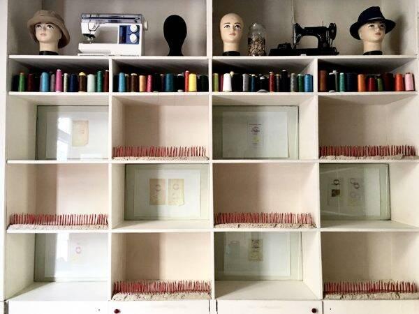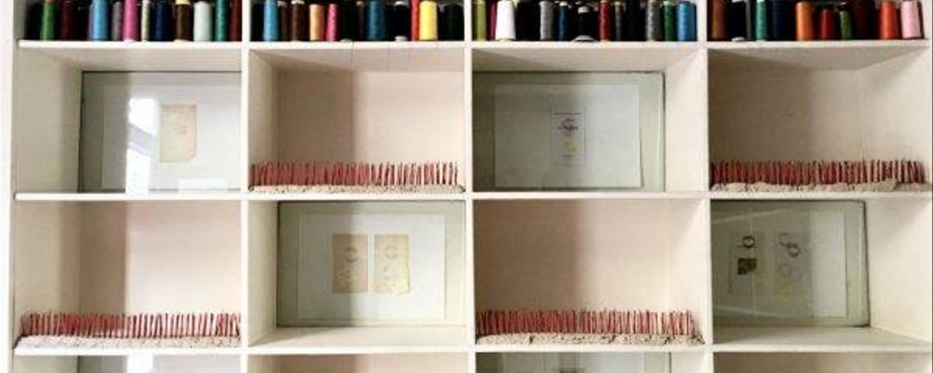 Le bruit des aiguilles entravées rappelle aussi, lointainement, le bruit d’autres aiguilles : celles de la couturière et du couturier. Les fantômes se croisent dans ce lieu où, la distinction entre objets usuels et œuvres s’amenuit pour ouvrir la voie aux rencontres, cousues et décousues, des passés proches et lointains, des présents individuels et collectifs. Sur les étagères, les bâtons d’encens, les pages ornées de baisers, les bobines de fil ont été réunis, pour le temps d’une réminiscence en partage.