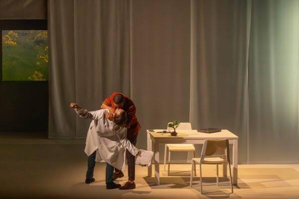 La scénographie de Romain Fabre épouse cette plongée dans l’enfer personnel de Faust. Des draps blancs et vaporeux s’ouvrent sur des paysages de plus en plus violents : la forêt paisible du premier acte fait place aux incendies puis à la mer déchaînée, mais Faust ne voit même pas ces ouvertures et les