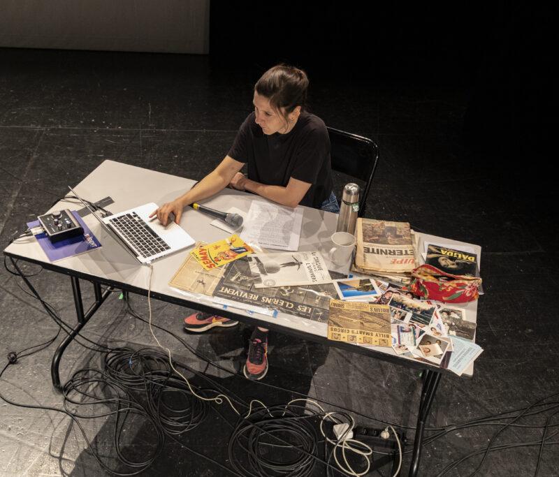 Sans perdre une minute, Anna Tauber entre sur le plateau, quittant sa place ombragée de dramaturge et d’administratrice. Elle était « trop impliquée dans cette histoire » pour ne pas être sur scène. Ce que nous allons voir c’est, par collage, la tentative de rendre hommage à Suzanne Marcaillou, voltigeuse de 1948 à 1965, autrice d’un numéro de cadre avec son mari Roger. De leur duo, Les Antinoüs, Suzanne a conservé les archives, elle qui a vécu toute sa vie dans le même appartement toulousain. Anna Tauber tisse une dramaturgie sensible entre son histoire personnelle et l’histoire de Suzanne, se montrant et s’effaçant au rythme des traces retrouvées et retenues. Avec le moins d’artifices possibles, Anna Tauber habite le plateau, avec pour outils le micro d’une conteuse, la table d’une dramaturge et les images et sons que nous découvrons sur grand écran. Archives de Suzanne Marcaillou, puis peu à peu archives personnelles d’Anna elle-même, archives filmées de numéros de l’époque où Suzanne travaillait, souvenir du Mondial de 98 et Dalida s’articulent autour des images de l’enquête d’Anna, des premiers entretiens et appels téléphoniques avec Suzanne jusqu’au projet un peu fou de reconstitution du numéro des Antinoüs.