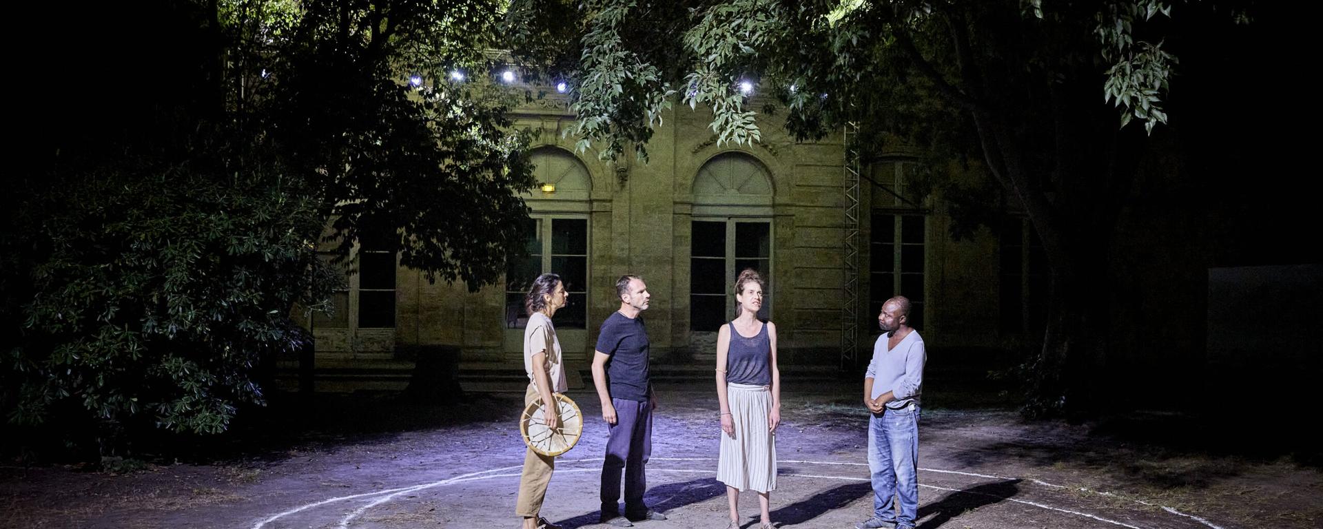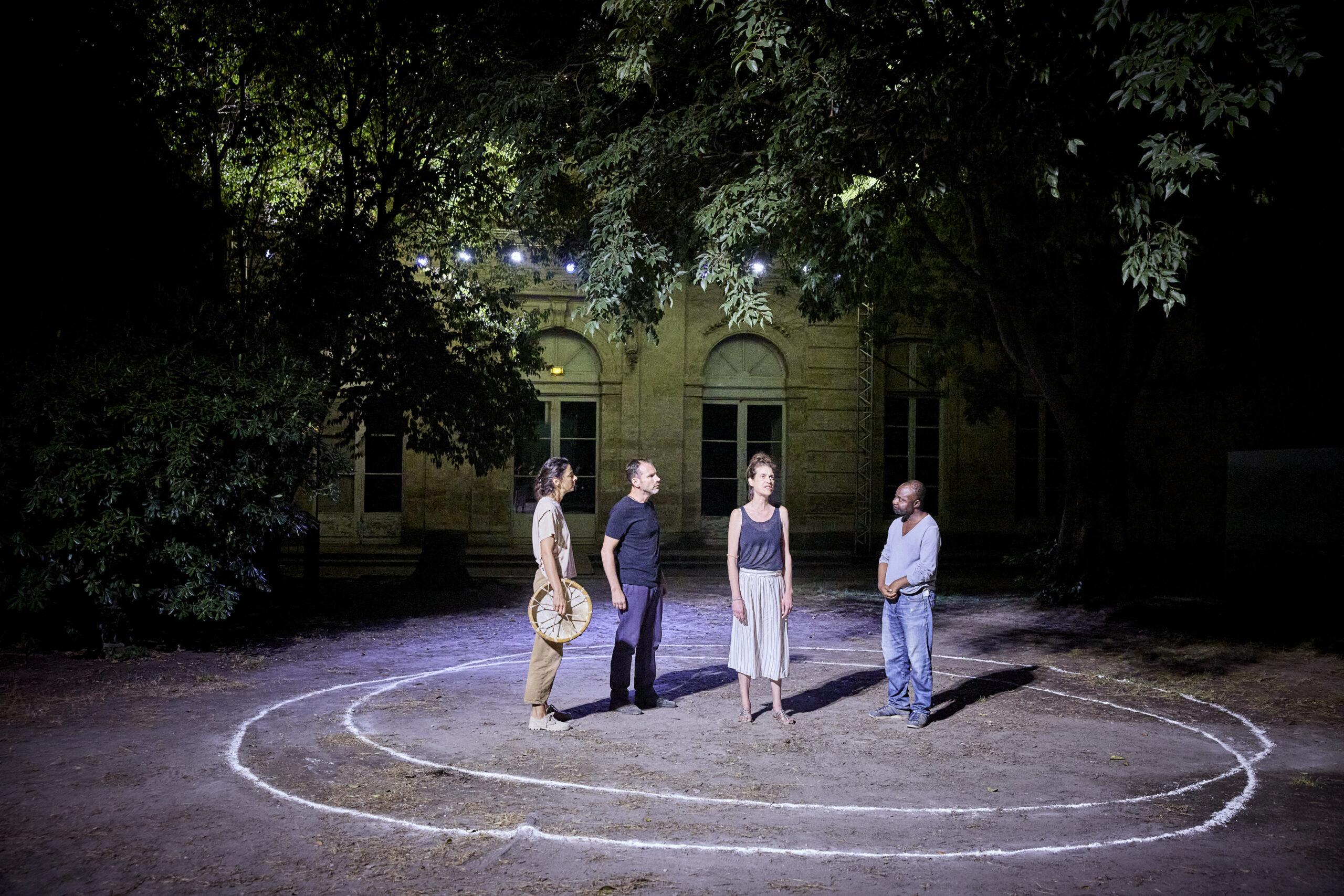 Je ne sais pas si c’est mon inconscient qui a fait mon programme de spectatrice à ma place, mais après avoir traversé l’emblématique Maison Jean Vilar pour atteindre le Jardin de la rue de Mons, j’assiste à la représentation de la pièce d’Eschyle, Les Perses, dans une mise en scène de Gwenaël Morin. Là encore, il est question de guerre, de fils partis, de mères qui pleurent époux et enfants, d’une tragédie qu’on suit de loin, impuissants, à travers les récits de messagers, avant de se complaire dans la plainte et crier à l’acharnement des dieux. La mise en scène est minimaliste et entend, comme souvent avec Morin, donner toute sa place à cette pièce patrimoniale en partie perdue comme le rappelle une technicienne qui interrompt la pièce au moment correspondant au fragment perdu. Les quatre comédiens qui viennent fouler la terre brûlée du jardin tournent en rond autour de deux cercles enchevêtrés qui disent à eux seuls la spirale tragique de la guerre, son éternel recommencement, son retour inévitable. Les plaintes et les suppliques, adressées au public souvent directement au pied des gradins, sont lancées sans réel travail du jeu et de l’interprétation, ce qui contraint les spectatrices et spectateurs à s’attacher à la teneur même de la tragédie dont on leur fait le récit. Morin dépouille, avec ses Perses, la tragédie de sa grandiloquence hyperbolique et de ses excès : pas de musique venue souligner le pathos de ce drame, pas de jeu de lumière venu amplifier la noirceur des nouvelles apprises. La proposition est audacieuse par le choix de l’épure qu’elle assume pleinement. Cela peut déplaire, mais même ce déplaisir à sa fonction. Il vient nous interroger sur ce qui nous plaît justement dans la tragédie : est-ce l’amplification du malheur d’autrui ? Est-ce le fait que nous sommes épargnés ? Glaçantes interrogations dans les temps qui courent…