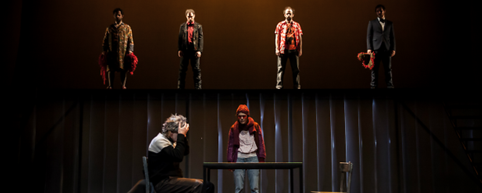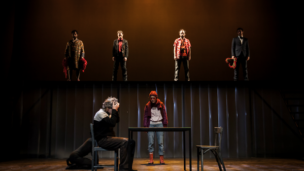 La pièce est construite comme un gigantesque puzzle où les différents morceaux de la vie de Julien s’entremêlent en suivant une chronologie non linéaire, et c’est là qu’il faut saluer le remarquable travail d’écriture des Sans Cou ; la force du spectacle tient en premier lieu à sa capacité à maintenir en haleine le spectateur, comme devant tout bon récit d’énigme bien ficelé. On se régale devant l’intelligence de la construction, tant elle mêle avec subtilité les différents niveaux temporels de l’histoire de Julien : la vie de Julien lui-même mais aussi celle de ceux qui le cherchent, à différentes époques – sa jeune épouse lors de la disparition, et sa fille grandie orpheline, des années plus tard. Comme Julien aux prises avec des bribes de son passé – un numéro de téléphone dans un portefeuille, une vieille cassette VHS, la photo d’une femme qu’il ne reconnaît pas – nous recollons aussi de scène en scène les morceaux de ce « moi » si étrange, celui qu’il fut autrefois, et l’on suit avec lui les indices qui le ramèneront à la clé de son identité. L’ensemble de la narration suit le fil rouge d’une interview avec Gaspar Kasper, autre pièce du puzzle : après avoir rencontré Julien, Gaspar a fait de l’histoire de notre héros un best-seller en la racontant comme la sienne, et s’est transformé en écrivain à succès ; le personnage lui colle même un peu trop à la peau tant l’identification a été profonde chez cet homme qui se révélera au cours de la pièce de plus en plus semblable à son patronyme – le « Kasper » étant l’équivalent allemand du Guignol… Comme Julien, nous sommes perdus dans un monde où il n’y a plus de référent sûr : guidés depuis le début par un « narrateur » qui se révèle un escroc à fausse barbe, nous ne savons plus qui croire.
