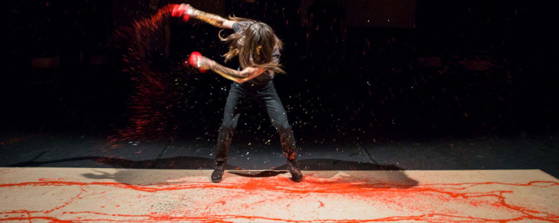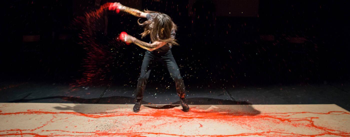 Pour évoquer cet irreprésentable de la guerre et de l’errance sur les mers, Pauline Bayle a travaillé la force des images, des face-à-face de corps tendus qui ne finissent que très rarement dans le corps-à-corps, et une écriture de lumières très soignée qui allonge les ombres et aiguise les profils. A cette esthétique léchée répond un jeu de matériaux simple mais efficace : terre, eau, peinture rouge, encre noire. Tout se déroule sur le plan du symbolique : peu d’affrontements directs, beaucoup d’adresses au public, la présence très dense des corps sert surtout de soutien à un texte proféré avec violence et détermination, tout au long des deux spectacles. Et c’est peut-être ce qui finit par lasser, à plusieurs niveaux. Certes, la beauté du texte nécessite qu’on l’entende clairement, dans toute sa force poétique. Certes, il n’est pas question de réclamer d’être divertis par une Charybde et Scylla en trompe-l’œil, un bruit de vagues ou des combats « réalistes ». Mais à force d’être déclamé à pleine poitrine, les subtiles nuances du texte n’apparaissent plus. Il n’y a pas de différence entre une scène intime de Pénélope et Ulysse et une provocation de combat entre Achille et Hector. Ces grands héros ne sont pas si loin de nous ; la force du récit est palpable, encore agissante aujourd’hui, elle nous parle de retour au pays, de paternité, de fidélité, de l’absurdité des conflits humains. Pourquoi alors les cantonner dans un ton tragique forcé, qui lisse tout ? Dans l’Iliade, les moments sur l’Olympe opèrent une mise à distance bienvenue et ajoutent une dose d’auto-dérision qui n’enlève rien à la puissance tragique – bien au contraire ! Cette mise à distance est perdue dans l’Odyssée, et c’est bien dommage.