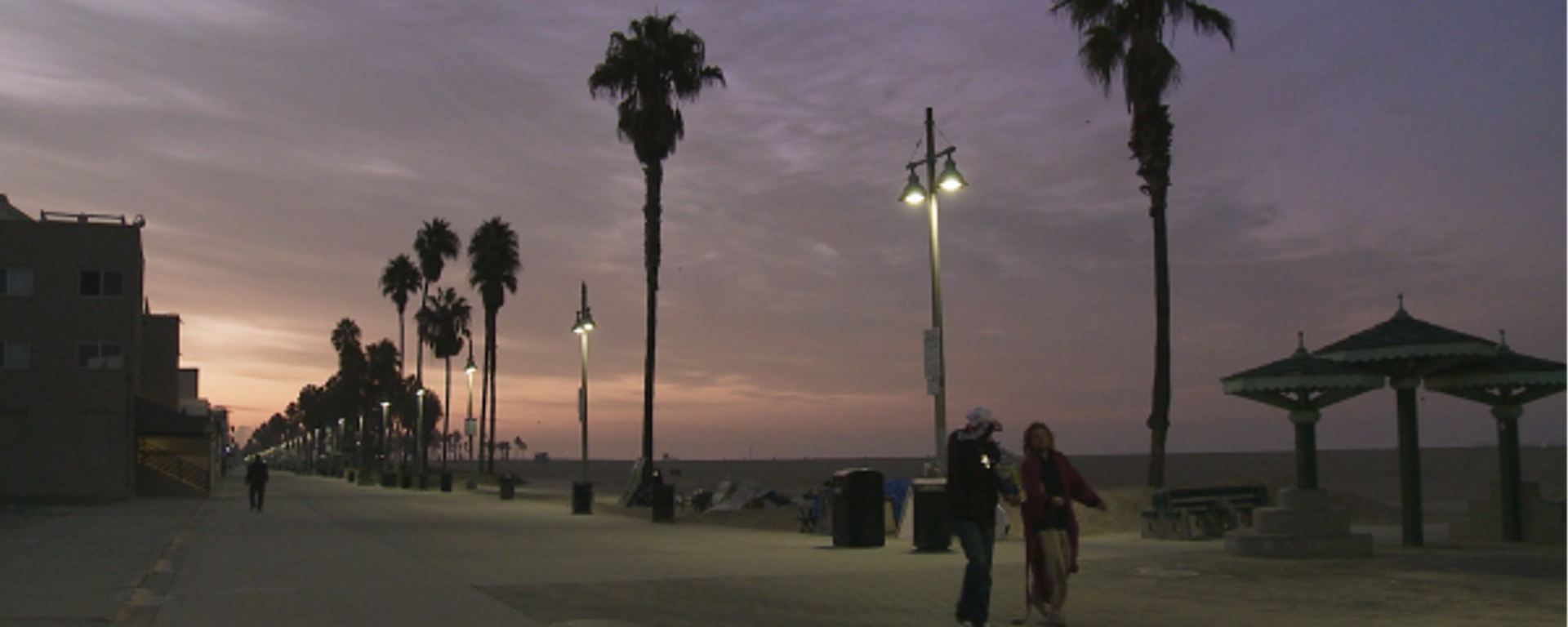 Hollywood – et son spectateur avec, il est vrai – adore fantasmer l’apocalypse et décliner dans ses productions la catastrophe en sa myriade de virtualités, toutes plus spectaculaires les unes que les autres : ère glaciaire, guerre atomique, invasion extraterrestre ou faille de San Andreas engloutissant toute forme de civilisation (étasunienne du moins), tous les moyens sont bons pour faire de l’extinction humaine une apothéose. Or, c’est bien à La-La Land que Marion Naccache a posé sa caméra pour y filmer une apocalypse, bien réelle cette fois et donc quasiment imperceptible. Dans la succession de plans fixes qui constitue l’unique régime d’images de VENICE BEACH, CA, la côte bétonnée de Los Angeles semble atteinte de léthargie, plongée dans un demi-sommeil qui la préserverait des vicissitudes du temps, royaume béni sur lequel le soleil se lève sans discontinuer, arrêtant montres et horloges sur une éternelle heure bleue. Un trouble chromatique qui dissimule aux yeux de tous le passage de la nuit au jour, dans lequel s’évanouissent sans-abris et junkies. Après le ghetto urbain, le ghetto temporel. Si la nuit elle appartient aux déshérités, Venice Beach cherche à se parer le jour d’un vernis éclatant : tout juste verra-t-on, en guise de rappel acide, un camion de pompier venir chercher sur la plage, sans hâte ni précipitation, le corps sans vie d’un infortuné anonyme.
