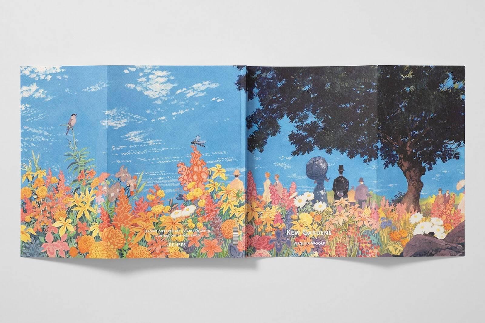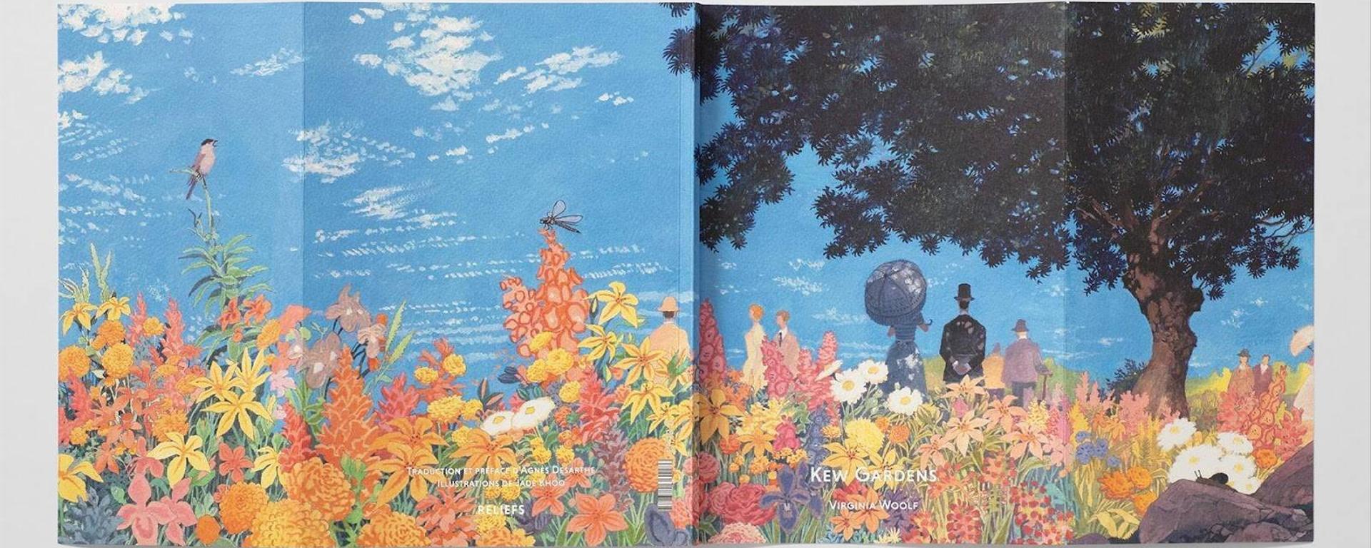 Comme le laissent présager les illustrations colorées qui jalonnent l’ouvrage, Kew Gardens constitue un voyage à travers la nature au cœur de la ville, ses couleurs et ses matières. Sa nouvelle édition est accompagnée des œuvres de Jade Khoo, qui avait déjà travaillé aux côtés de RELIEFS, notamment à la conception de couvertures et d’illustrations de revues.