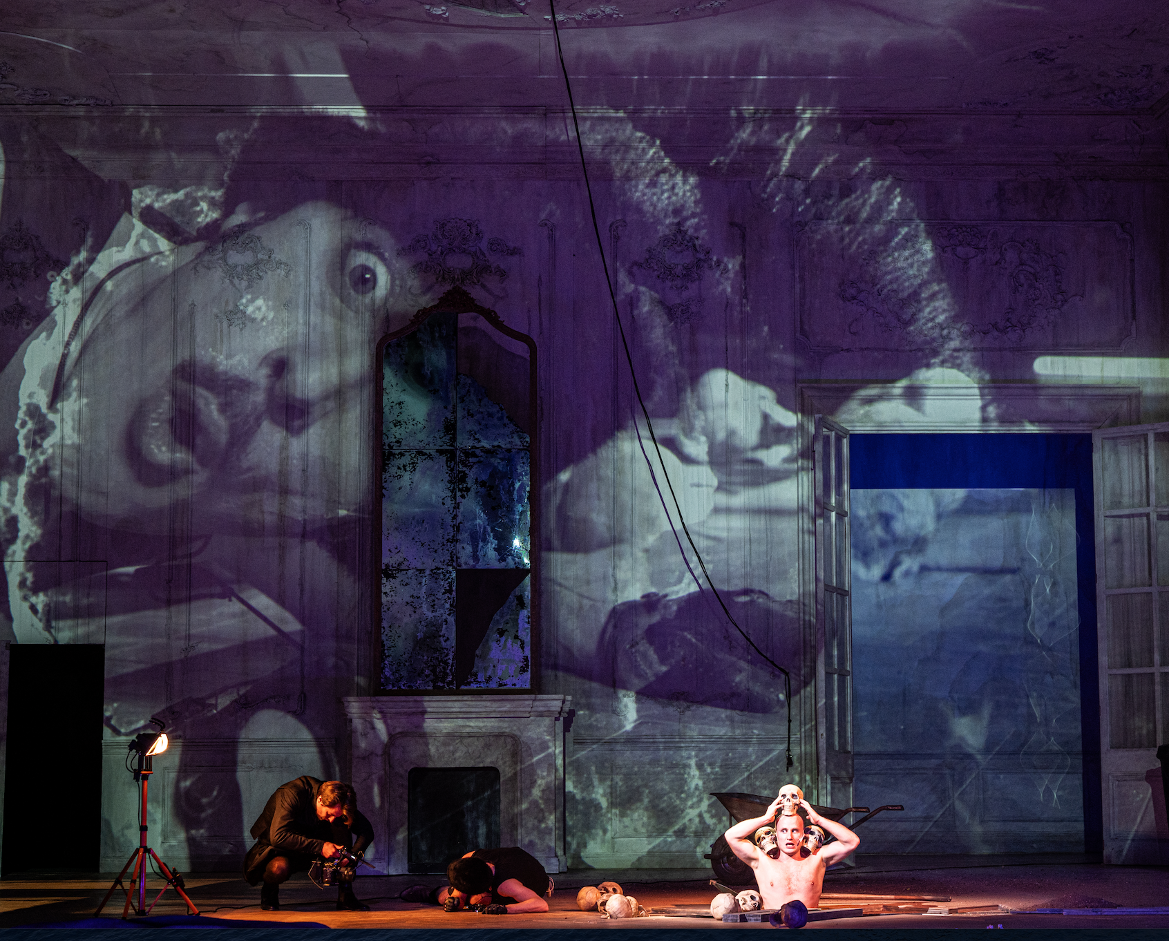 Lorsque l’imposant rideau du Théâtre du Châtelet se lève, la scène présente l’intérieur décrépit d’un appartement bourgeois. Les hauts murs et leurs moulures d’un autre temps entourent, à jardin, de hautes fenêtres qu’aucun rayon de lumière ne parvient à percer de sa chaleur et de sa promesse de lendemain. Au plateau, la lumière est blanche, presque celle d’une salle d’opération à l’hôpital. L’imposant miroir qui surmonte la cheminée de marbre est encore recouvert de vieux draps, empêtré même dans de beaux draps. Deux comédiens entrent au plateau par la double porte du fond. L’un d’eux, le savoureux Odin Lund Biron, pousse une brouette remplie de crânes, l’objet-totem dont la seule présence sur un plateau de théâtre évoque instantanément le personnage d’Hamlet et, avec lui, les restes de Yorick, le bouffon du roi Hamlet le père, que manipule le prince du Danemark dans l’acte V de la pièce. L’autre, Bertrand de Roffignac, se met rapidement à genoux pour vomir tout le sang qu’il a fait couler : c’est le prince Hamlet, anéanti autant que révélé par l’injonction vengeresse de son père mort. D’emblée, la méthode du spectacle est indiquée aux spectatrices et aux spectateurs. Refusant de suivre la chronologie et la dramaturgie de la pièce originale, il ne s’agira pas, avec Hamlet/Fantômes, de représenter pour la énième fois la pièce aussi emblématique que mystérieuse (voire emblématique parceque mystérieuse) de Shakespeare, mais bien plutôt d’interroger ce qui, dans les thématiques, les enjeux et les interrogations métaphysiques et sociales de la figure d’Hamlet, en fait l’un des terreaux – parfois pourris – de la culture européenne, et même de la culture russe. La pièce ne sera pas non plus une nouvelle hagiographie du génie Shakespeare, encore moins une ode naïve, complaisante ou ingénue au théâtre.
