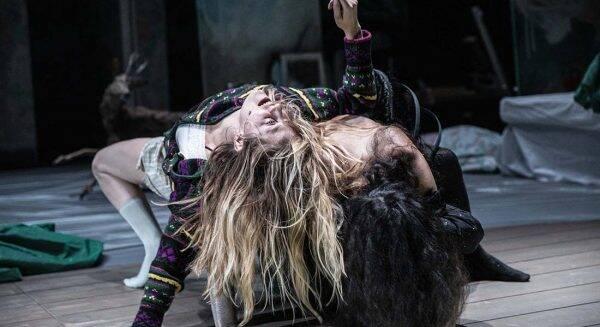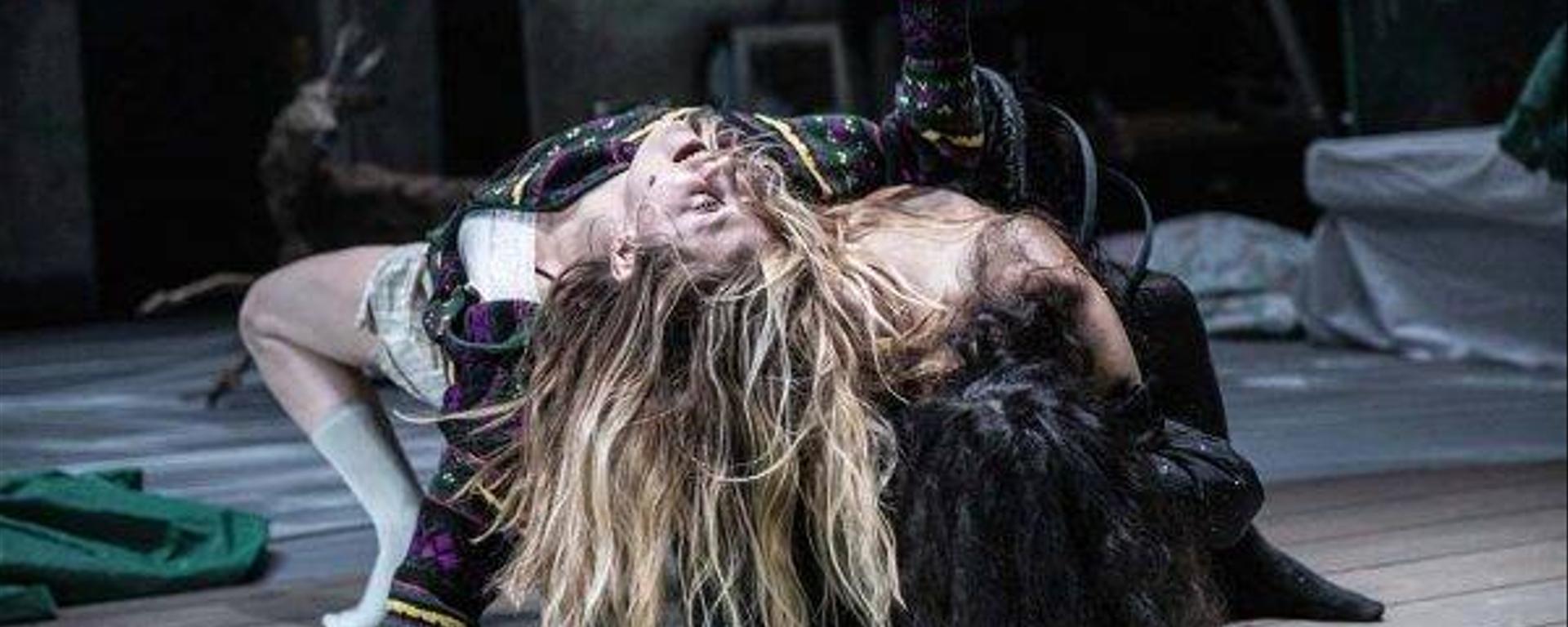 Tous, cependant, sont confrontés à la maladie de la fille, de la petite-amie, et au deuil à venir. L’intrusion du mal incurable dans le cercle familial entraîne avec lui son lot d’interrogations et de remises en question. Un mal qui fait tomber les masques pour révéler la profondeur cachée, les secrets enfouis derrière la tapisserie. C’est ainsi qu’entre en scène Theraphosa Blondi, la mygale Goliath, la créature hybride issue de l’imaginaire fantasmagorique de Chimène. Cette chose indéfinissable et magistralement interprétée par Jean-Gabriel Manolis envahit le plateau par sa « danse du corps obscur », le butō, une technique de danse transgressive née dans le Japon des années 60. La danse matérialise les limites de la parole. Elle instaure une dimension onirique et inquiétante qui fait entrer le langage corporel sur scène. Quand la parole ne suffit plus, Theraphosa Blondi prend le relai en touchant les personnages et pénètre ainsi dans les zones les plus sombres que chacun tente désespérément de dissimuler. Par ses mouvements et ses questions répétitives (« Qu’est-que tu veux ? »…), la créature met en exergue la violence refoulée d’Ulrich, les peurs déstabilisantes de Rose et les excès de rage de Domino. Chacun se trouve ainsi contaminé par un même mal qui, d’une certaine manière, semble plus profond et plus mortel que celui de Chimène.