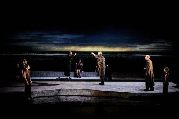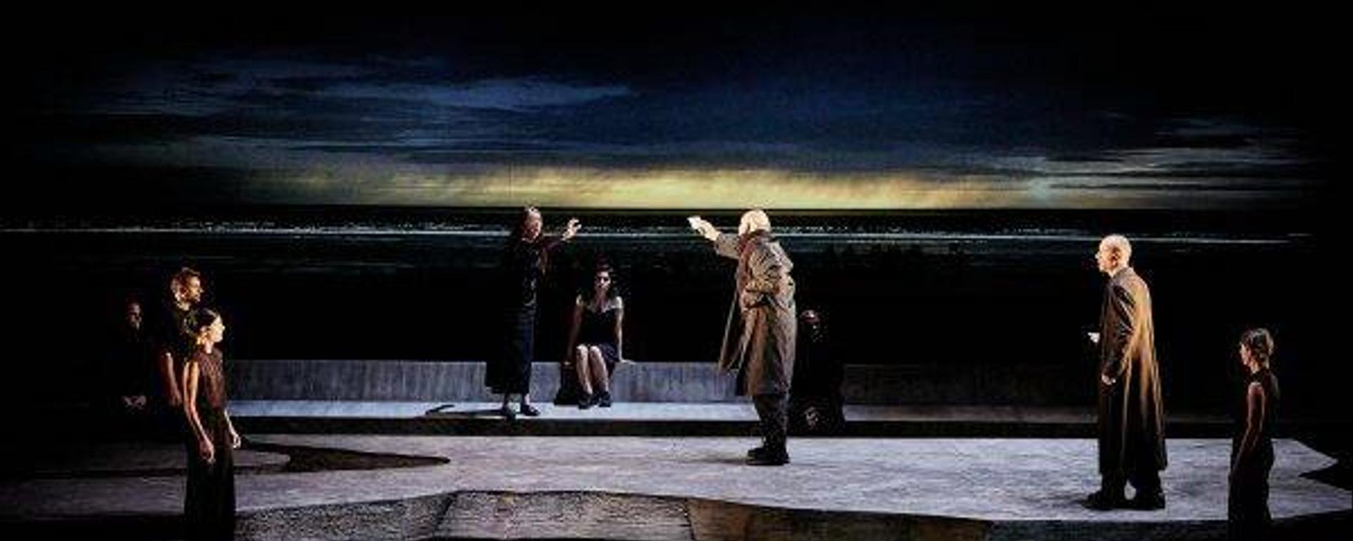 L’histoire est connue. Les Grecs attendent que le vent se lève pour partir combattre à Troie, mais irrités contre Agamemnon, les dieux exigent le sacrifie de sa fille Iphigénie pour que revienne le vent, et que puissent partir les navires. À partir de cette trame mythologie, la mise en scène d’Anne Théron orchestre une série de dialogues rythmés par les interventions du Coryphée qui décrit dans un procédé de mise en abyme théâtrale les mouvements et sentiments des protagonistes. On assiste ainsi aux échanges tantôt désespérés, tantôt virulents entre Agamemnon et Ménélas, entre Clytemnestre et Achille. Devant nous, les dialogues déroulent le dilemme auquel se trouve confronté ce père forcé au meurtre de sa fille, au nom de la survie du peuple grec. Véritable tempête sous un crâne, les longs échanges manquent, hélas, de dynamisme et de passion – ce que semble pourtant exiger la tragédie. Face à l’horreur du sacrifice d’une jeune innocente, les personnages dissertent sur ce qui est juste, sur le sens de l’État, sur les liens du sang. Avec en fond de scène des images vidéos d’une mer étale ou d’un ciel sombre la scénographie peine à convaincre ; de même qu’on s’interroge sur le sens de ce plateau mobile, dont les comédiens vont peu à peu détacher des morceaux – sans doute un symbole appuyé du déchirement du cœur d’Agamemnon.