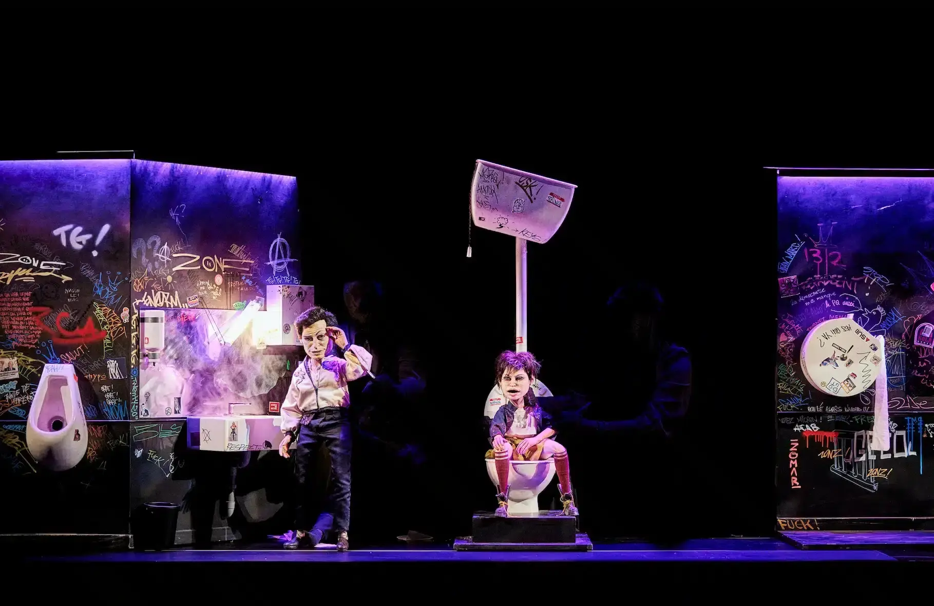 Il s’agit donc de « déconstruire » – un principe très en vogue dont se saisit Johanny Bert dans une mise en scène qui frappe par son réalisme. Ses marionnettes de grande taille, construites sur le modèle des Bunraku japonaises, fascinent par leurs expressions plus qu’humaines et leur gestuelle ultra contemporaine. À ce titre, le décor digne d’un film d’Hollywood répond merveilleusement bien à ce niveau de précision. Pourtant il se craquèle face à un doute terrible : le metteur en scène est-il légitime ?